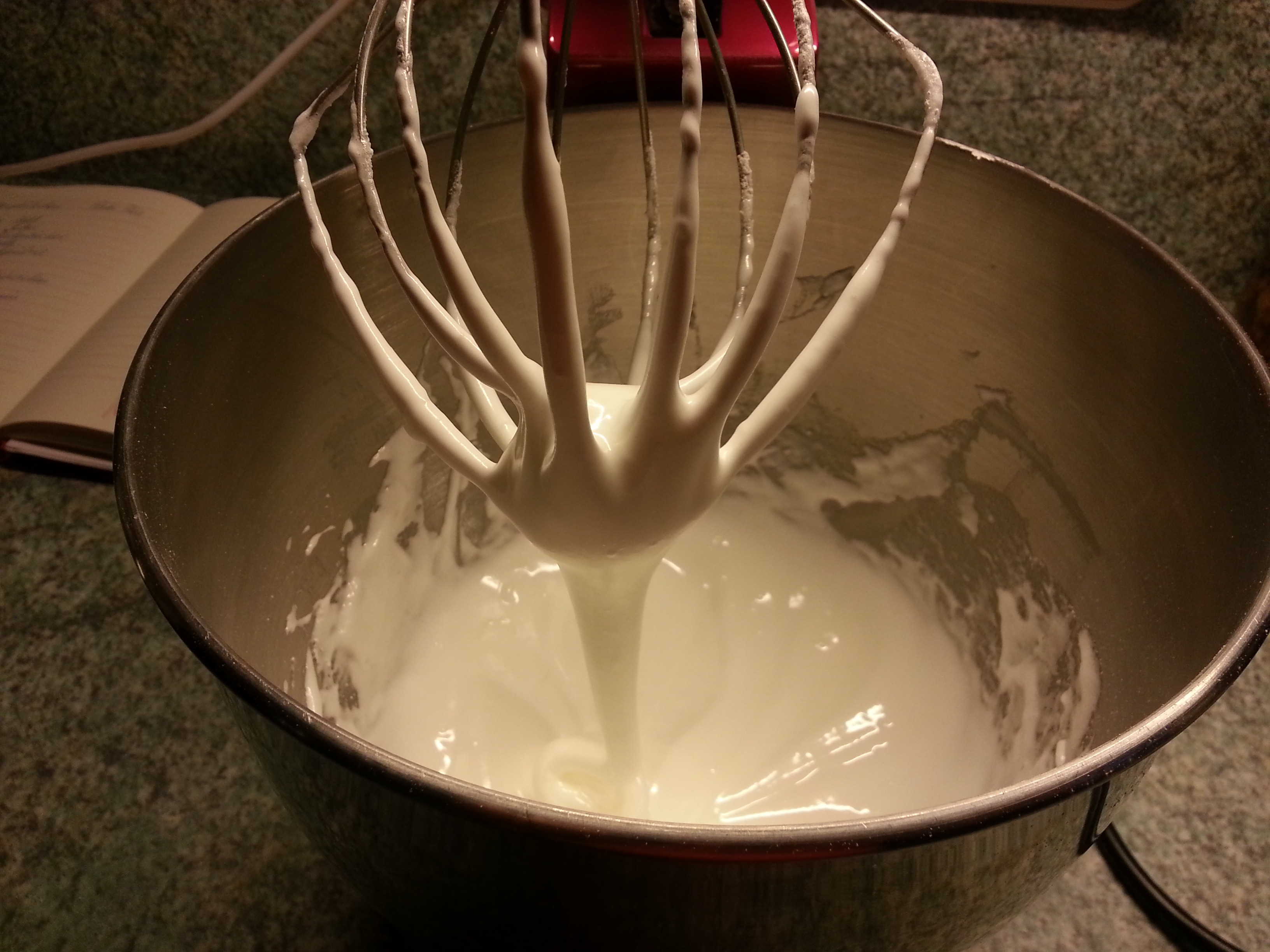 Das Eiweiss schön steif schlagen, den Puderzucker gesiebt nach und nach dazugeben (Eiweiss weiter schlagen).