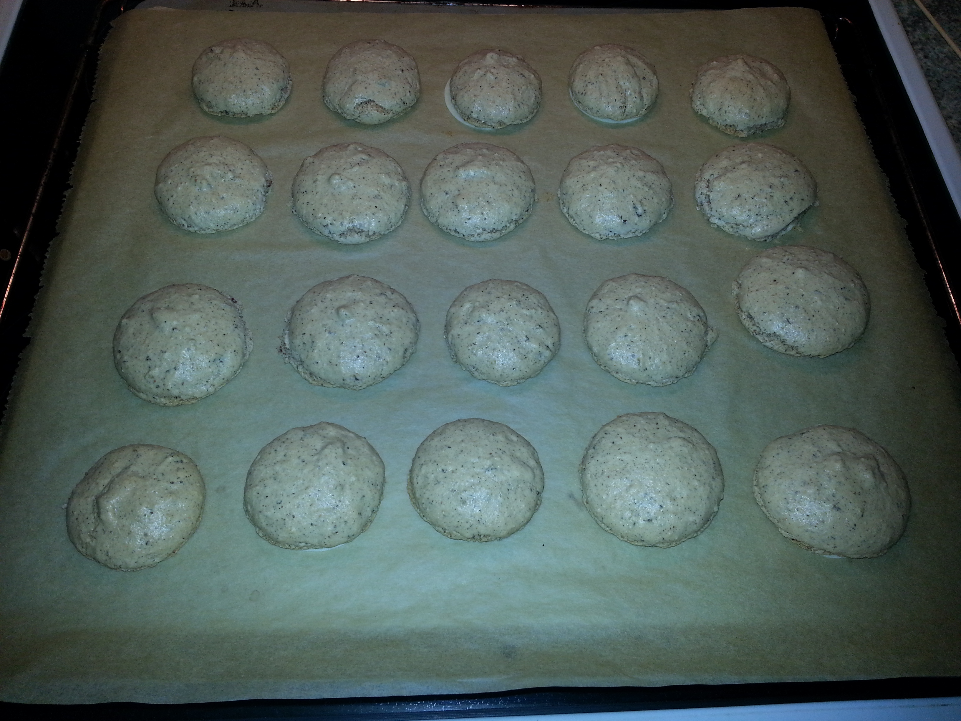 Auf dem Backblech die Oblaten verteilen, mit dem Spritzbeutel (Löffel geht auch) die Masse aufspritzen. So ein richtiges Hütchen wollte mir nicht gelingen……hm.