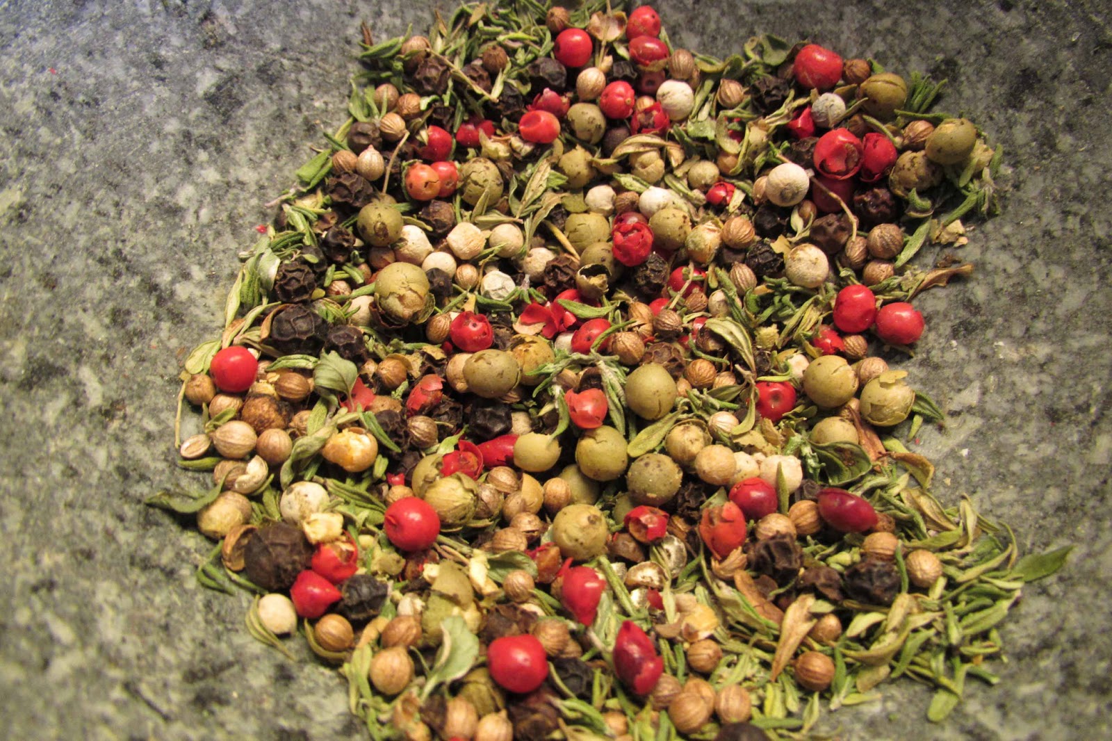Die endgültige Gewürzmischung bestand aus verschiedenen Pfeffersorten, die wir im Möser mit Thymian zerstoßen hatten.