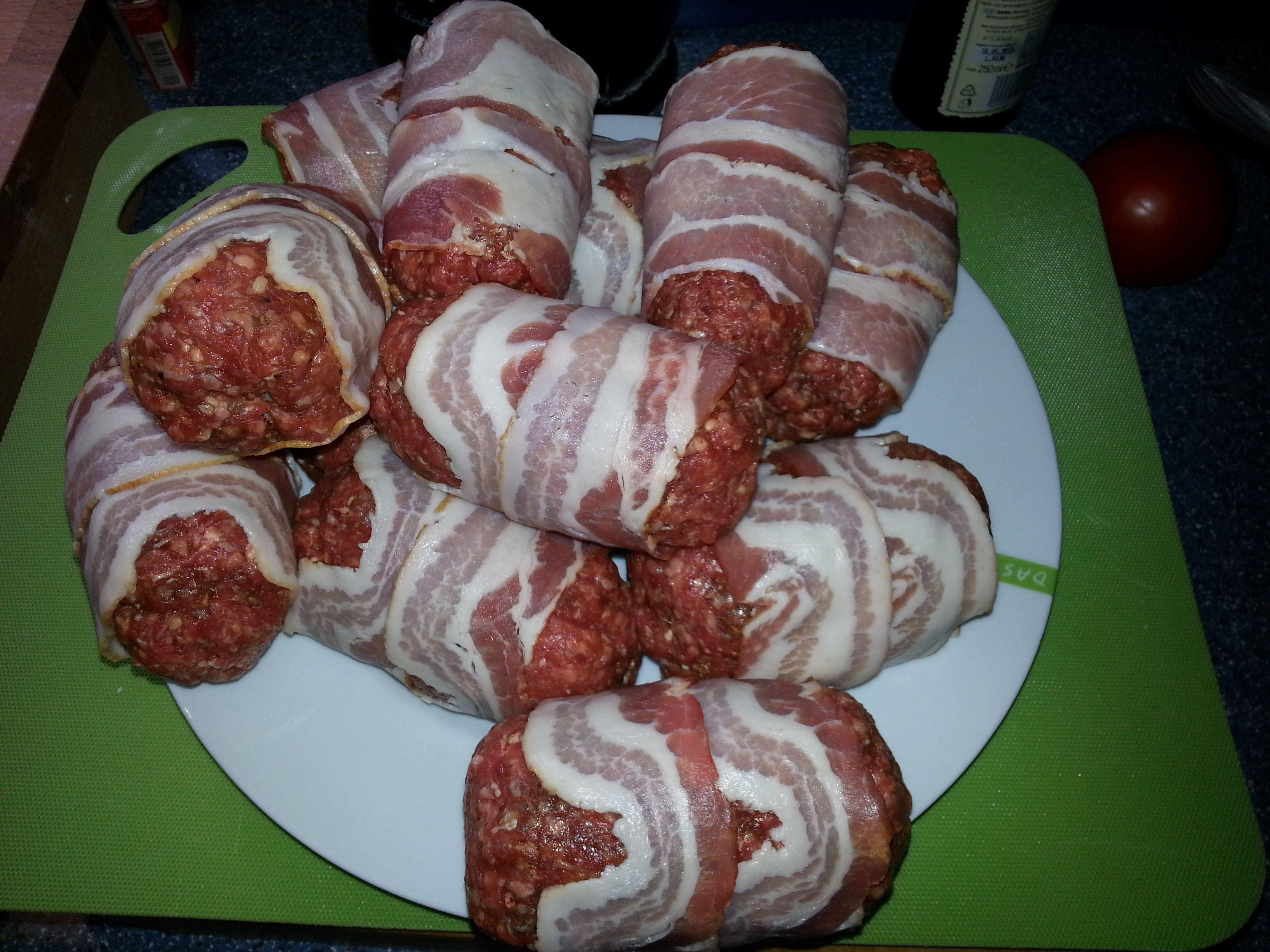 Jetzt wird der Bacon drum gewickelt, ich denke, 2 Streifen sollten je nach Größe des „Ei´s“ ausreichen.