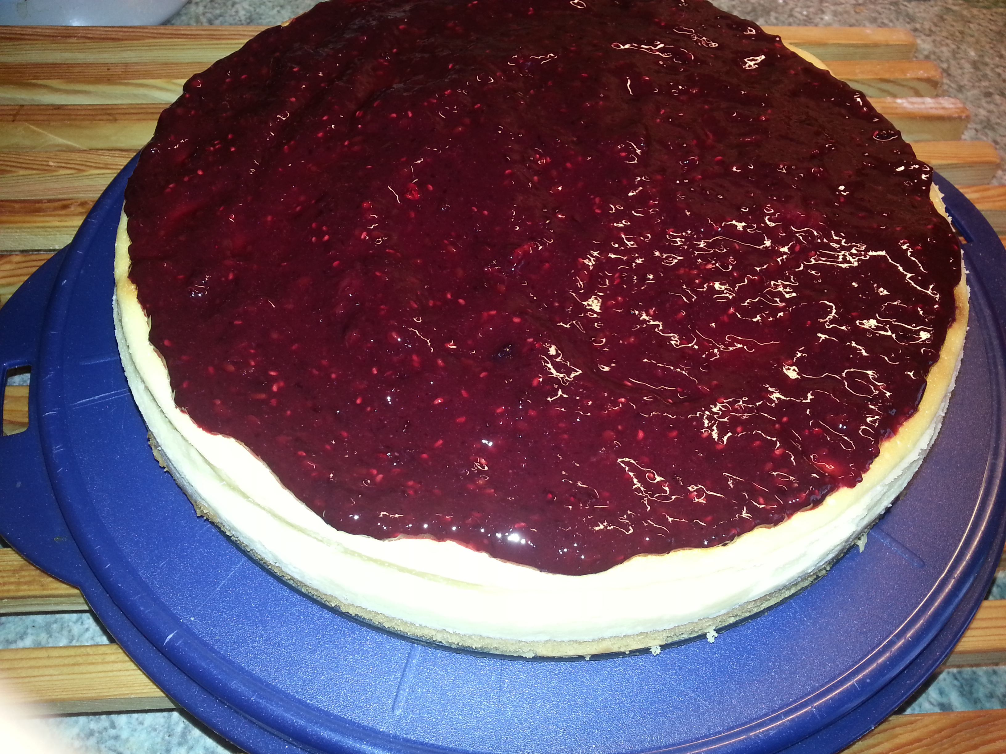 Nach dem Abkühlen auf dem Cheesecake verteilen. Das sieht sensationell aus, der schneeweisse Kuchen und der Kontrast der dunklen Blaubeeren (oder den anderen leckeren Beeren).