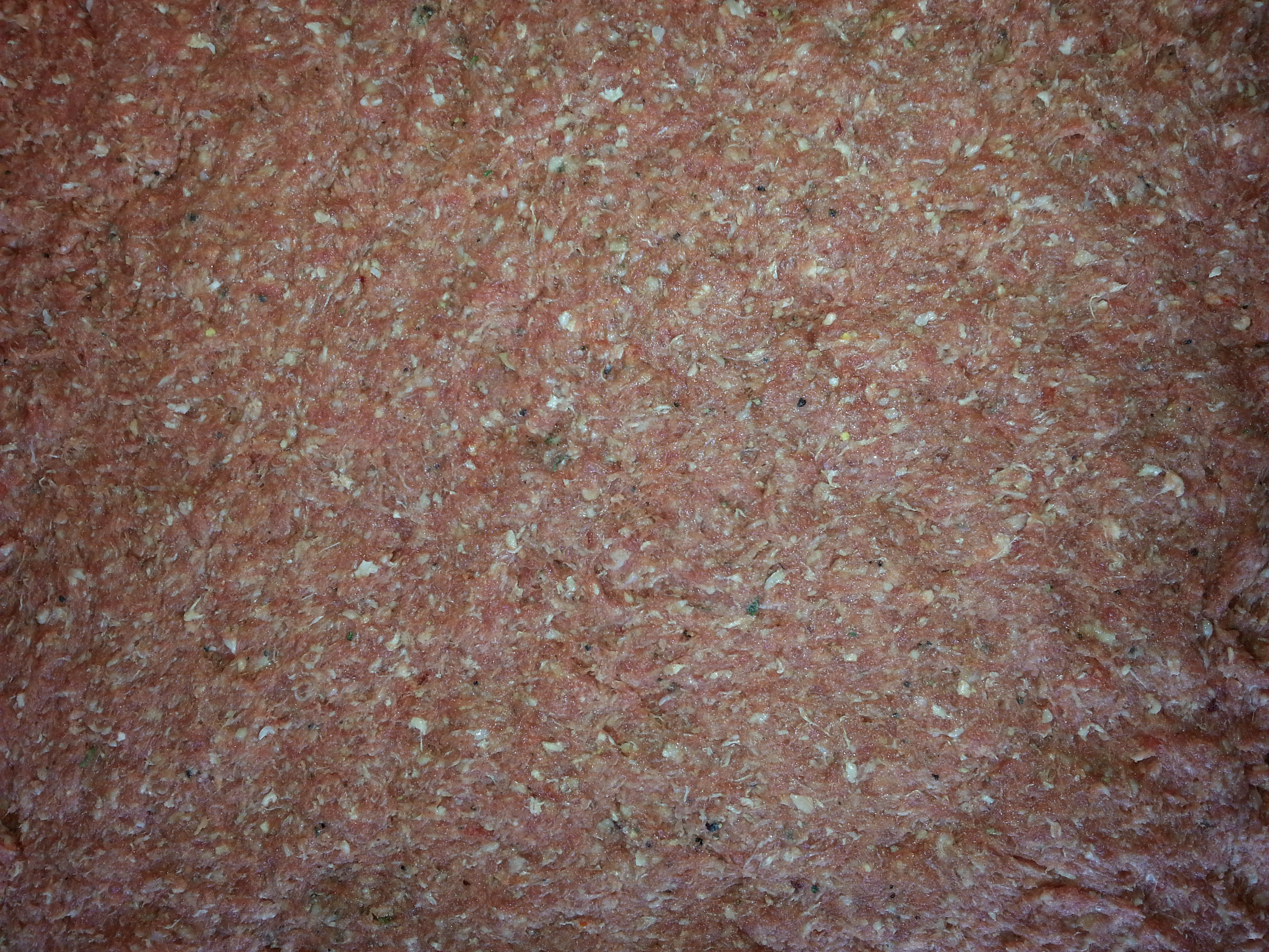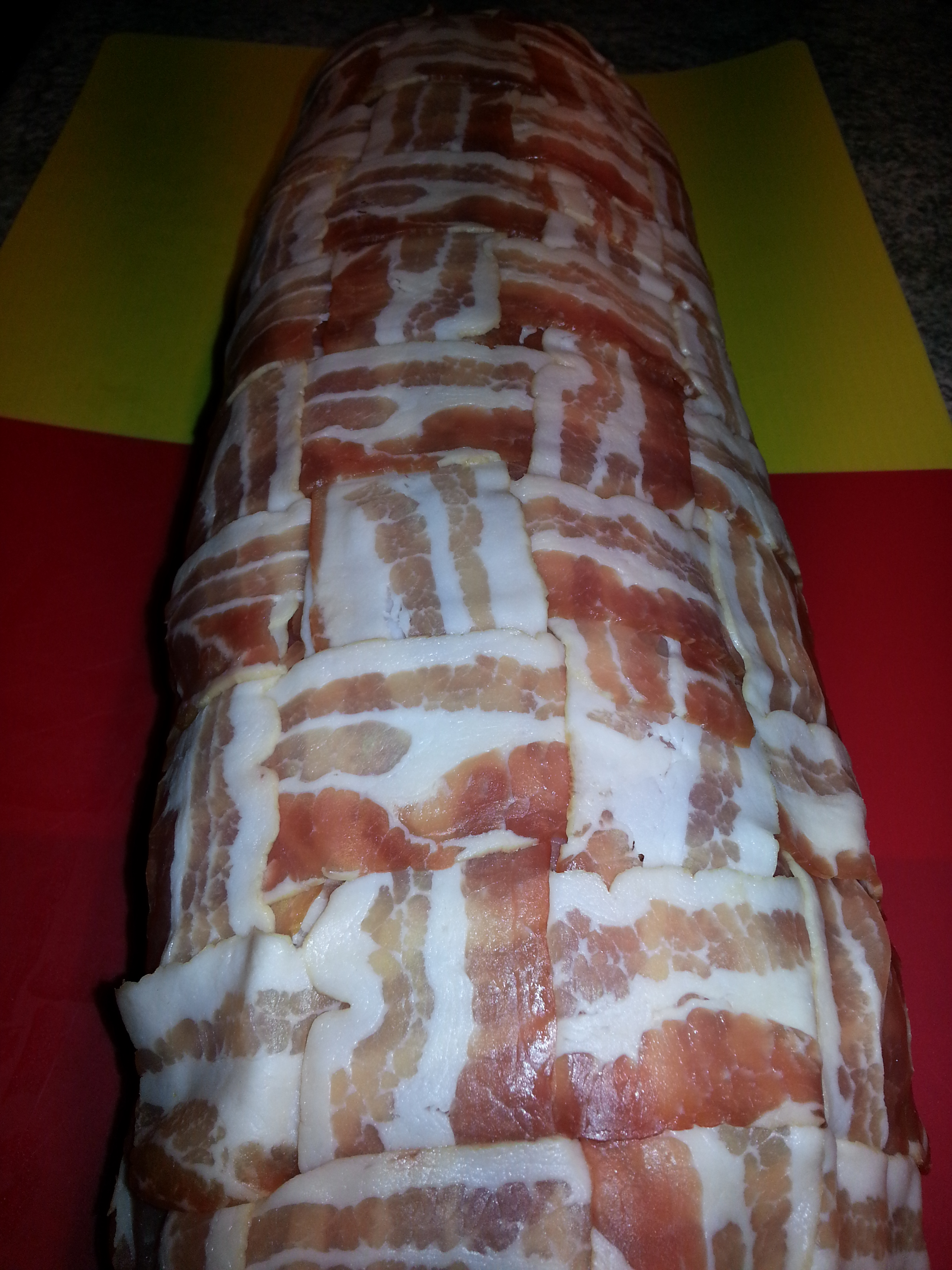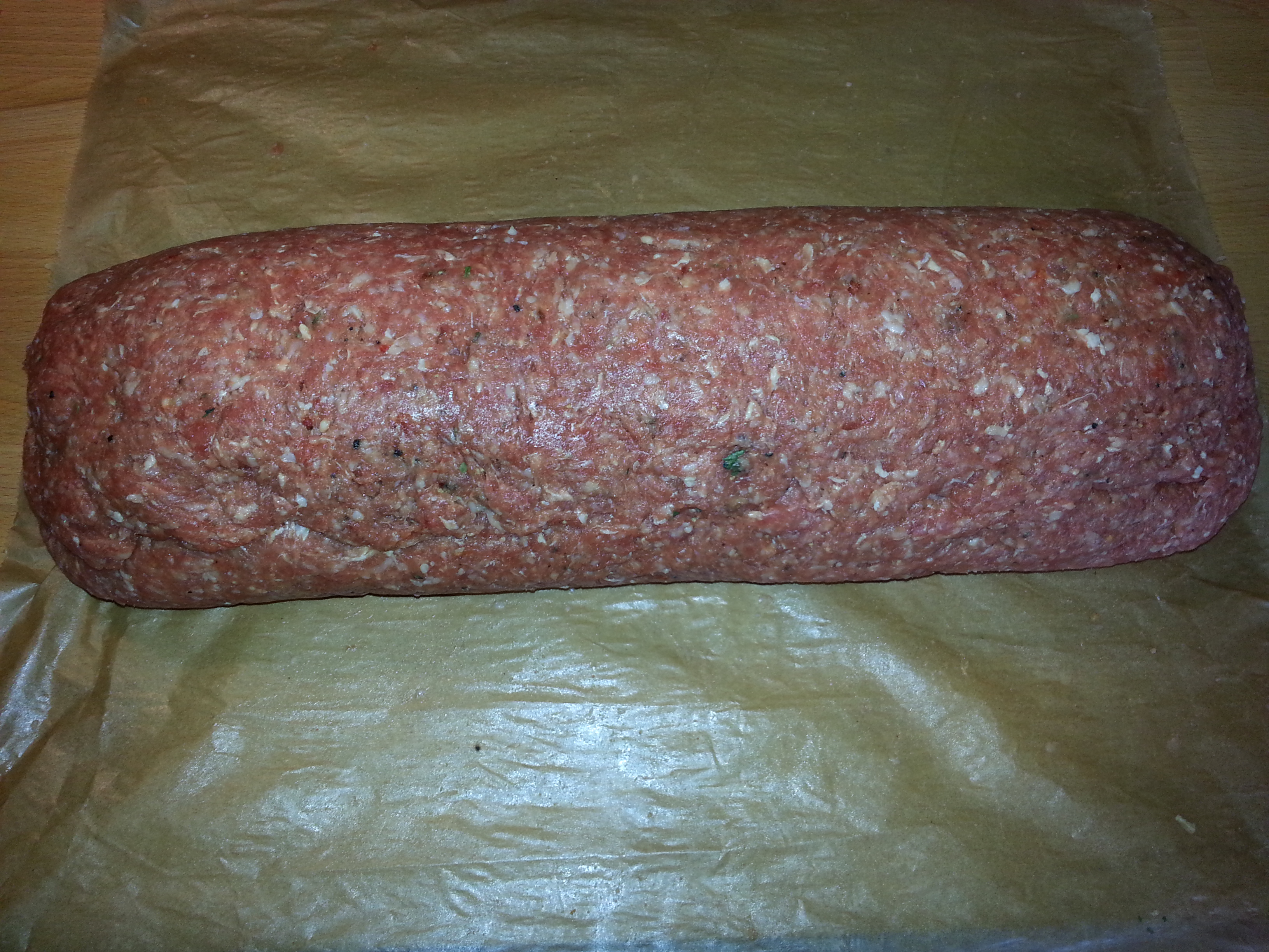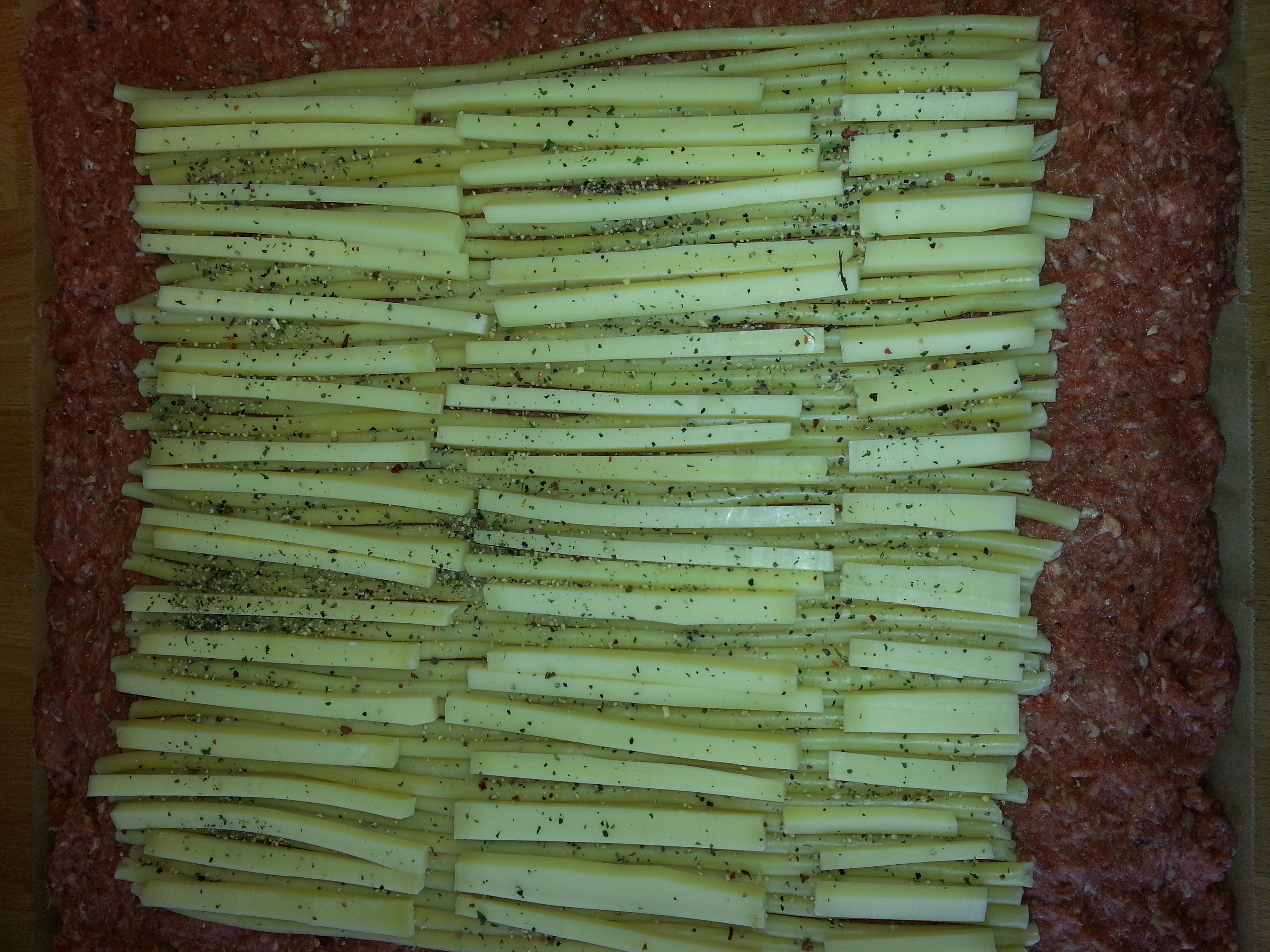 Dann wurde das Hackfleisch ordentlich gewürzt und gleichmäßig auf einem Stück Backpapier (oder Frischhaltefolie) verteilt. Die Fläche der Hackfleischmasse sollte etwas kleiner sein als das geflochtene Bacon-Netz.