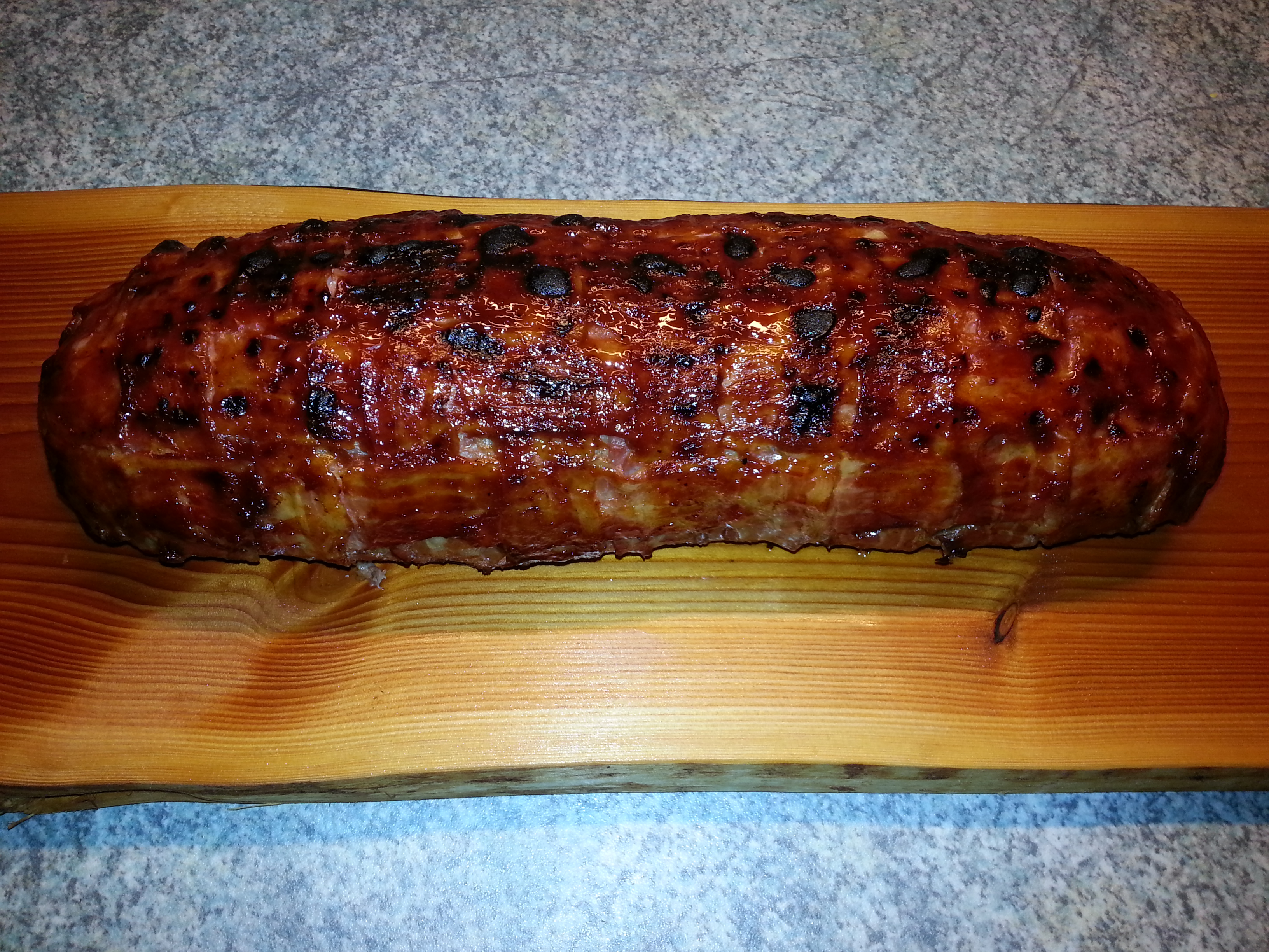Garen kann man das Ganze auf dem Grill (indirekt, ca 160Grad, ca 2,5h), oder im Backofen bei 180-200Grad (zweite Schiene von unten). Es empfiehlt sich, ein Thermometer zu benutzen, die Kerntemperatur sollte mindestens 70Grad betragen.
