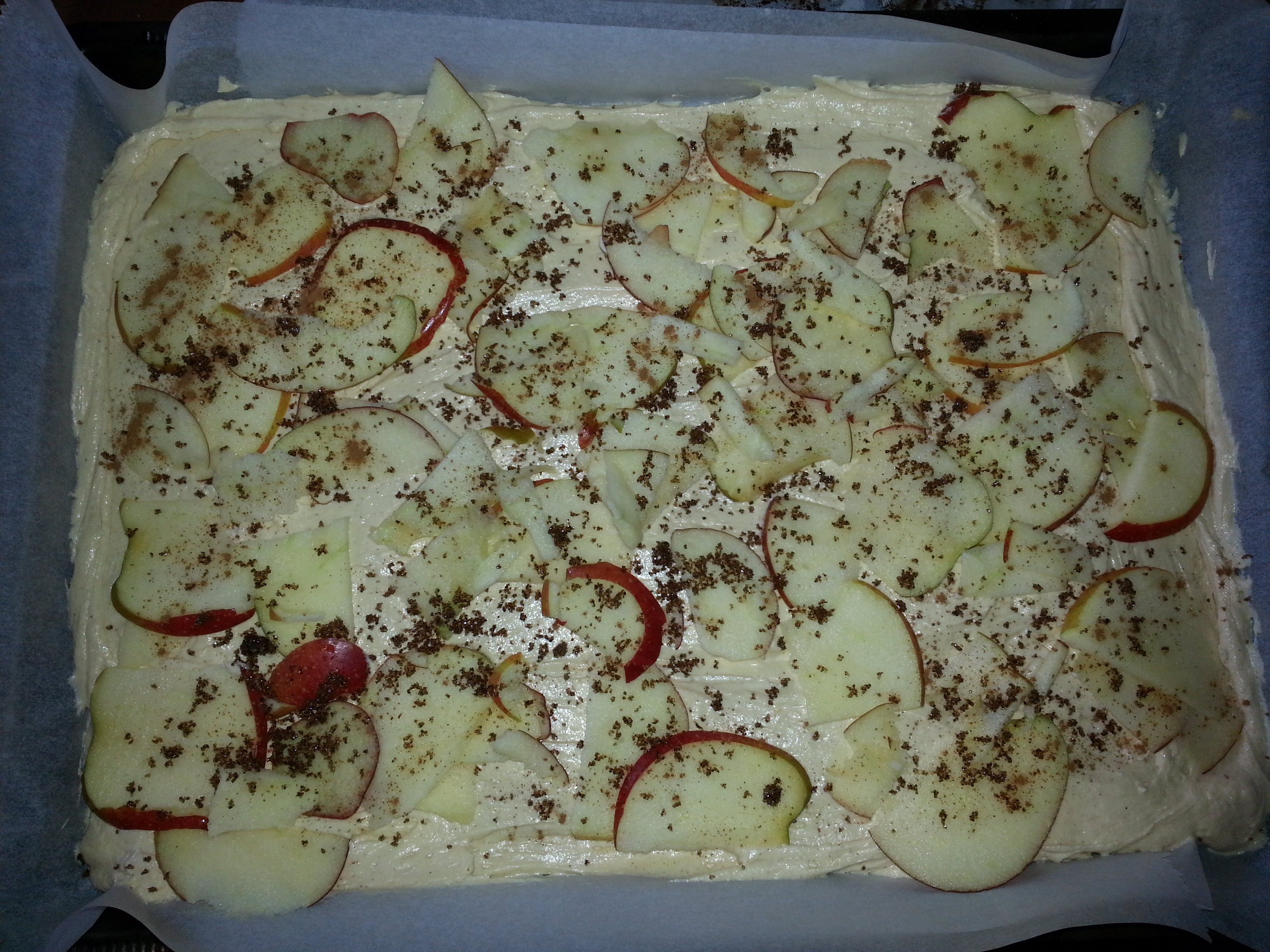 Jetzt kommt der Apfel zum Einsatz, den keiner mehr wollte, weil er schon etwas schrumpelig war. Also kurzerhand gehobelt und auf den Rührteig verteilt. Zusätzlich noch mit etwas Zimt bestäubt und dunklem Muskovadozucker drüber gestreut.