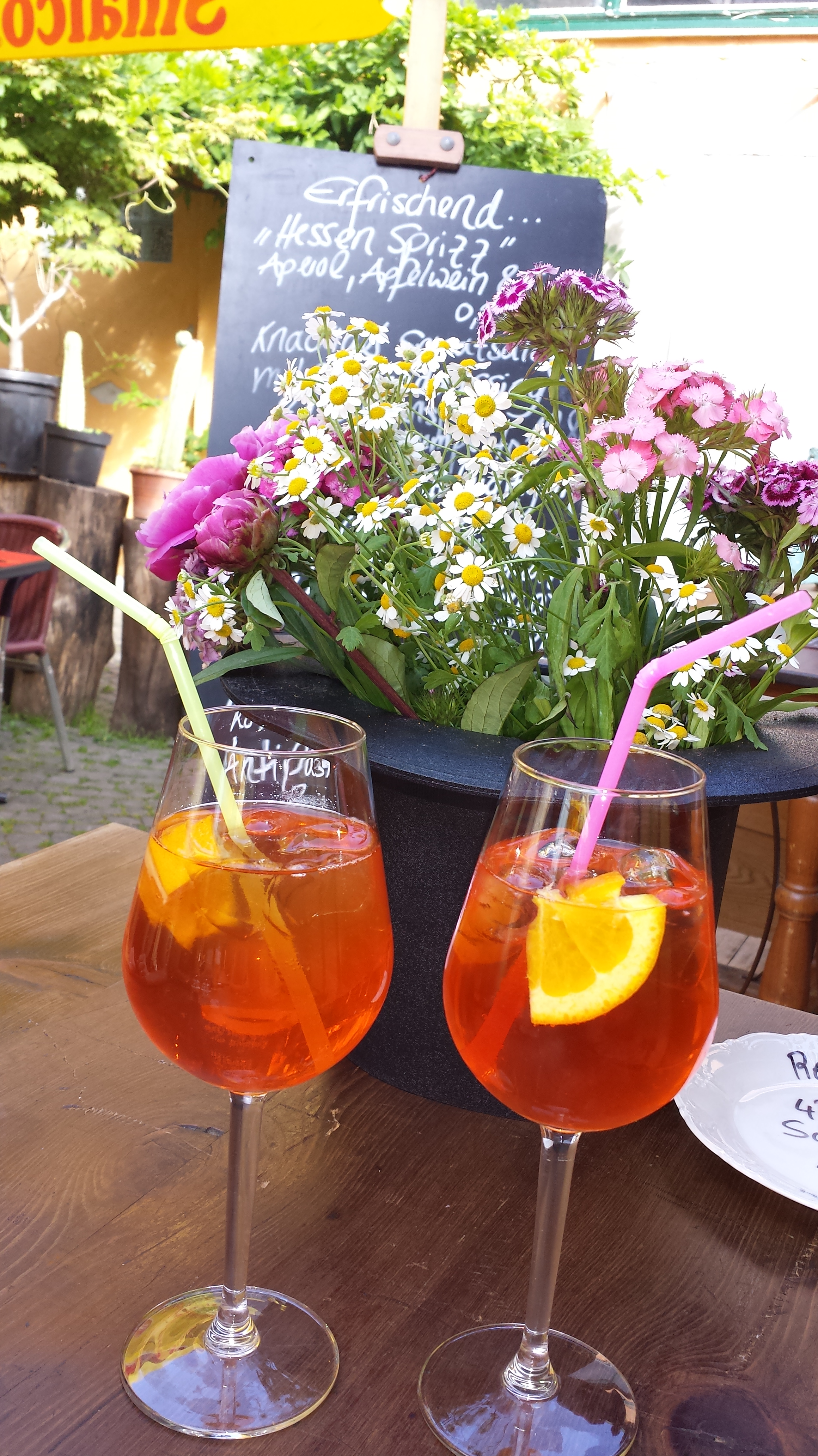 Eine neue Variante des Sprizz durften wir im Biergarten genießen, es gibt bei uns im Ort nämlich die „hessische“ Variante des Sprizz! Aperol, Apfelwein und Soda! Seeeeeeeeeeeeeeeeeeeehr lecker und sehr süffig!