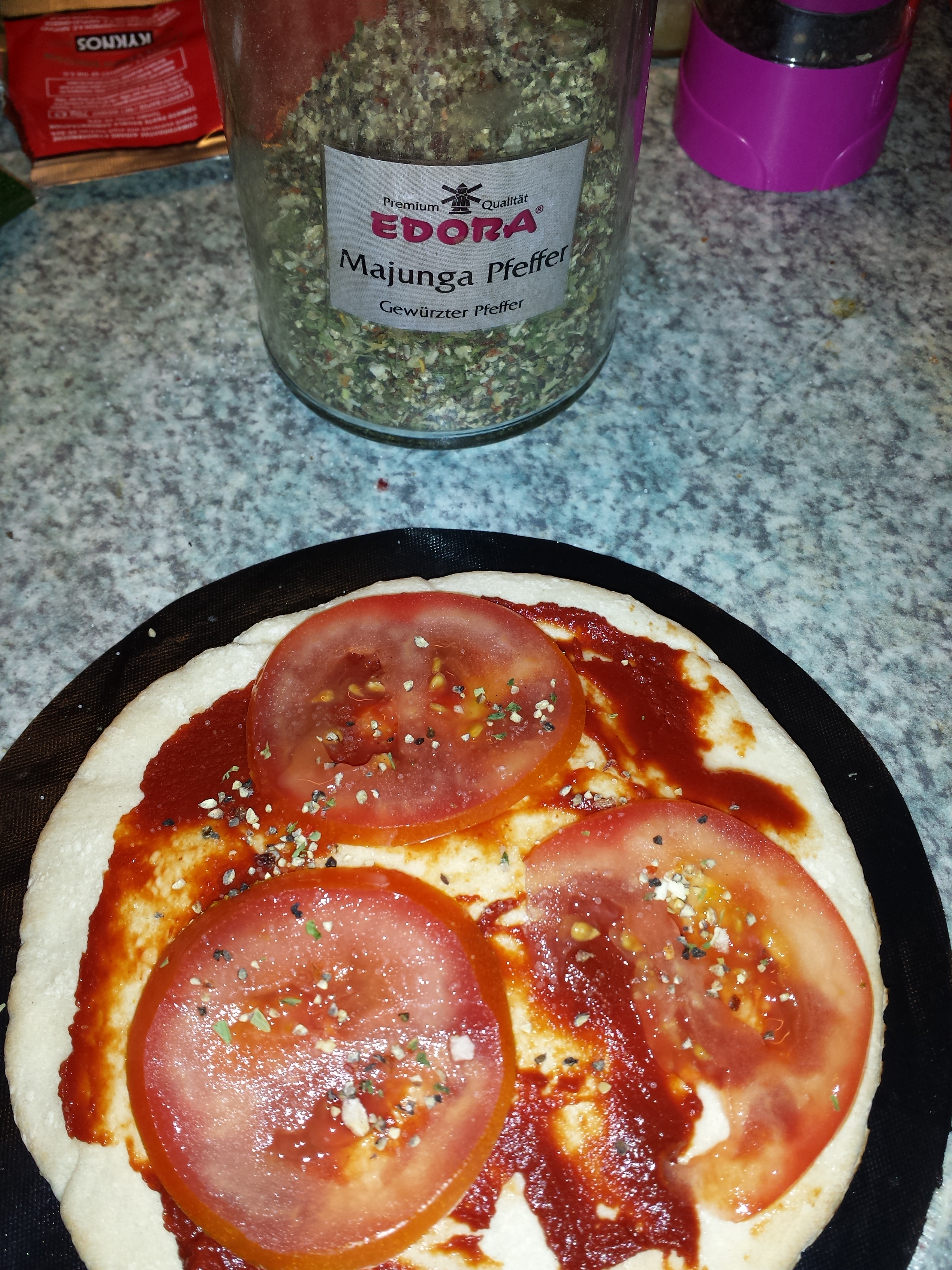 Damit es nicht zu trocken wird, habe ich ein paar dünne Scheiben Tomaten drauf gelegt und mit etwas Salz und Pfeffer gewürzt.