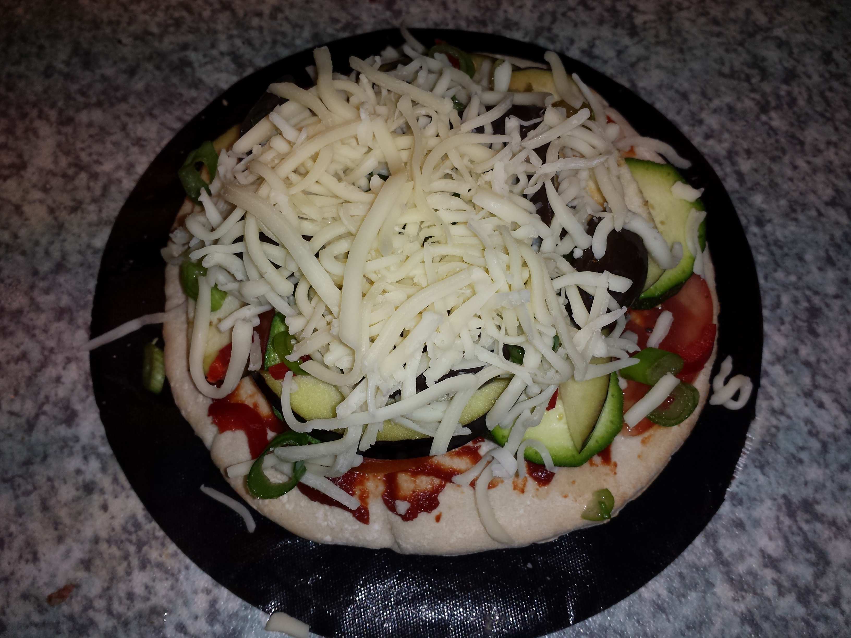 Und um noch etwas Würze dran zu bringen kamen zum Schluss noch etwas Frühlingszwiebel und schwarze Oliven drauf. Das Finish war ganz normaler Reibekäse. Hier kannst alles verwenden, was du noch im Kühlschrank hast, Hauptsache es verläuft im Ofen.