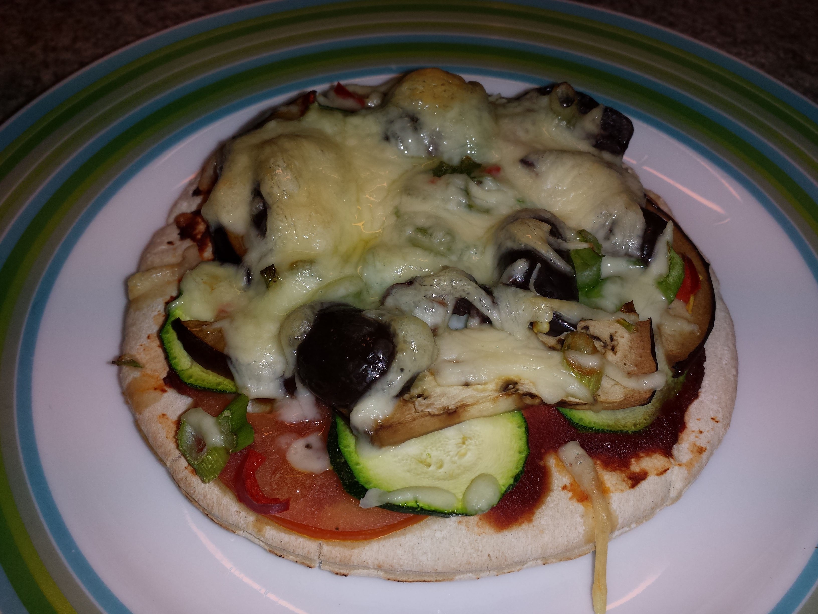 Den Ofen hatte ich auf 200Grad vorgeheizt und die Pizza kam für ein paar Minuten rein, bis der Käse schön verlaufen war.