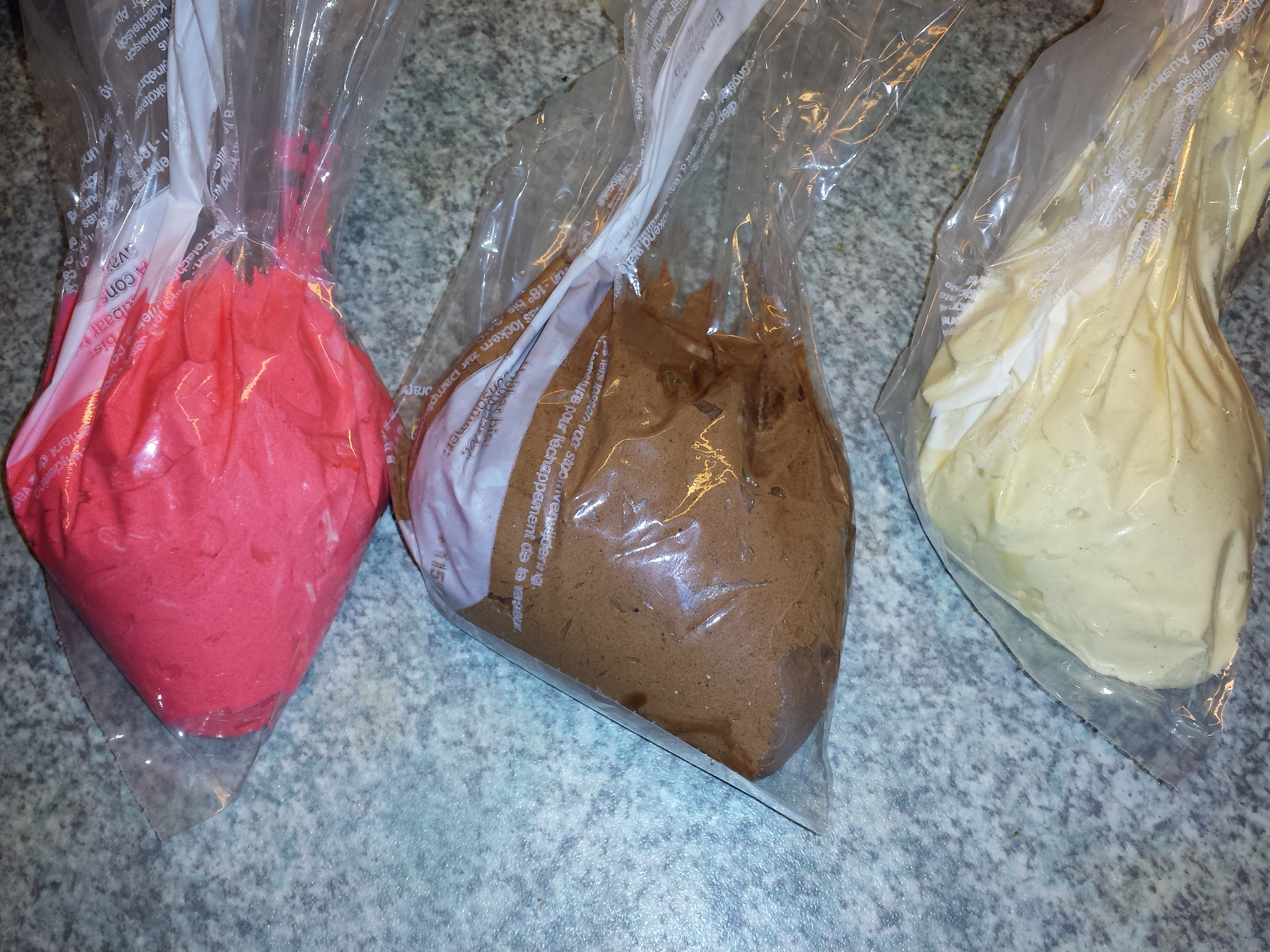 Für den dunklen Teig habe ich 2EL Kakao und 1 EL Wasser beigemengt, für den pinkfarbenen etwas Lebensmittelfarbe (von Wilton).