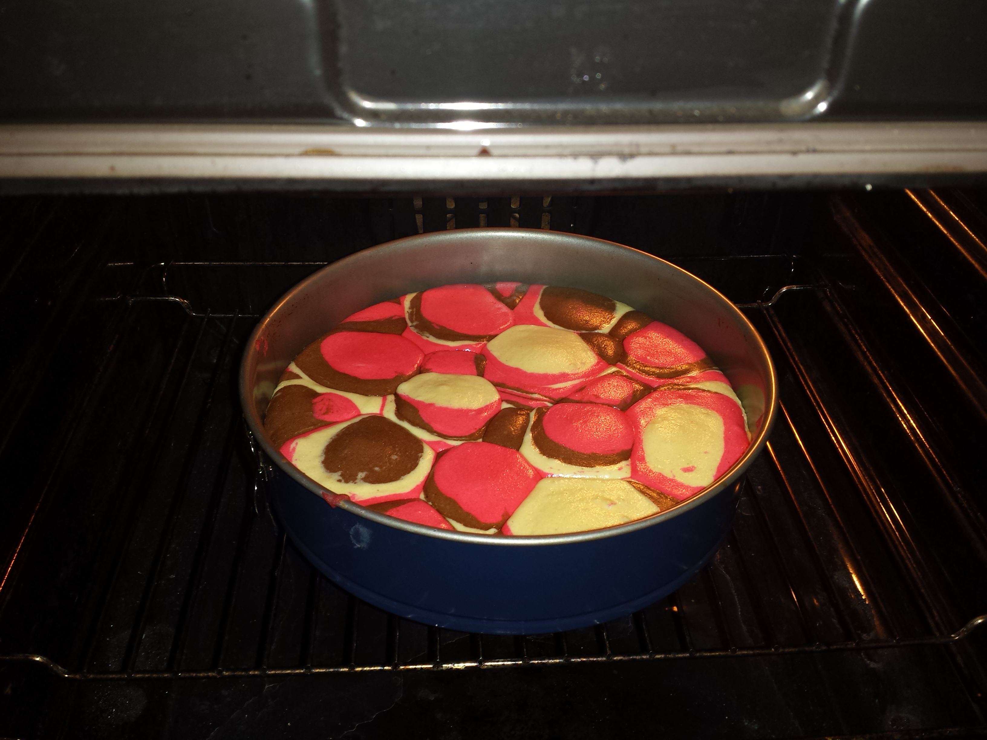 Nun setzt man einen Klecks Teig auf, nimmt die nächste Farbe und setzt einen weiteren Klecks in den bereits vorhandenen. So geht es immer weiter, es entstehen kleine Hügel. So verfährt man, bis die Form gefüllt ist. Die Zwischenräume werden einfach mit den Resten aus den Spritzbeutel aufgefüllt.
