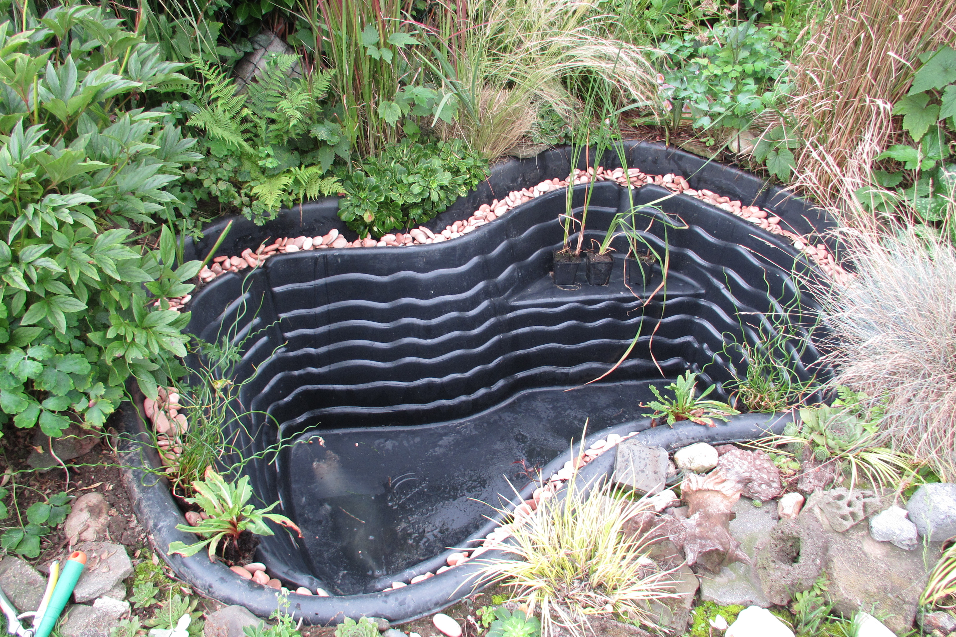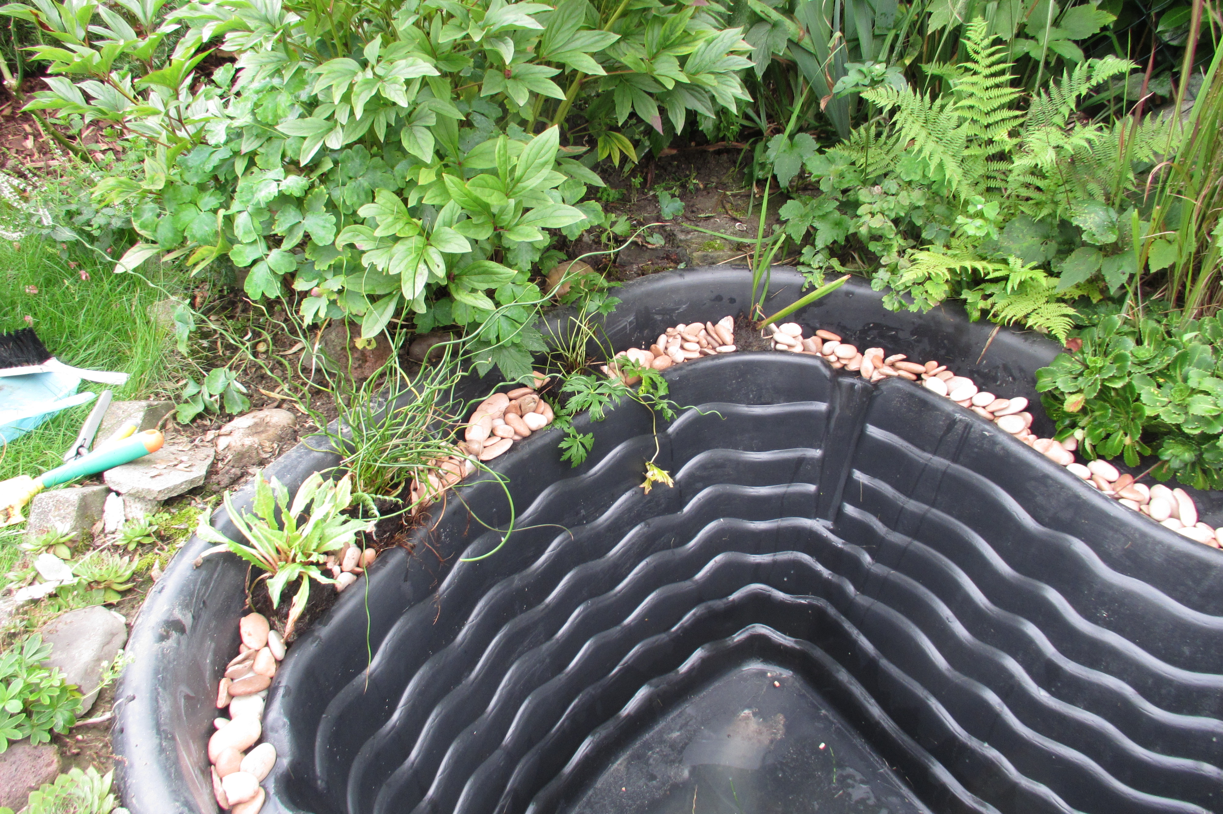 Danach haben wir Kies gewaschen und am Rand verteilt, die Pflanzen gesetzt und schon hieß es „Wasser Marsch!“