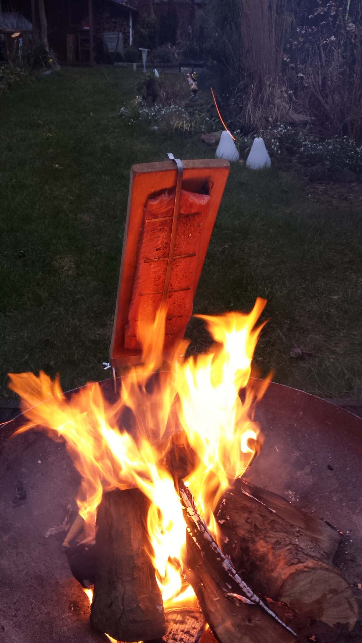 In der Feuerschale inzwischen ein schönes Feuer machen. Achtung, kein Nadelholz verwenden. Am besten eignen sich Obstgehölze, Buche oder Eiche. Den Lachs mit dem Brett in die Halterung stecken und die Neigung über dem Feuer/Glut anpassen.
