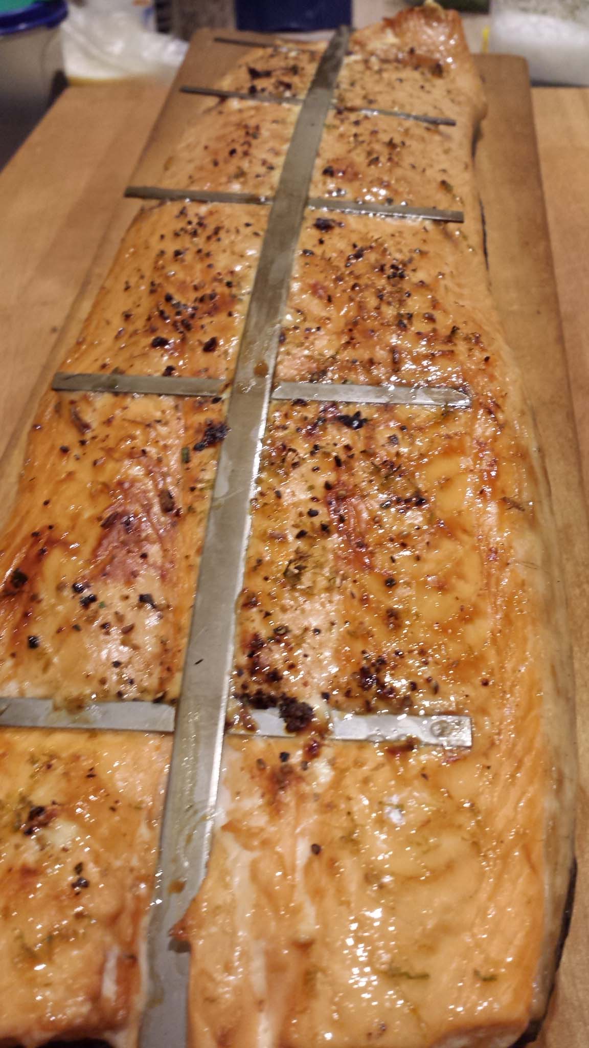 Lachsseite auf die Größe des Holzbrettes zurechtschneiden. Eventuell noch vorhandene Gräten entfernen. Das Holzbrett muss gewässert werde, nicht vergessen.