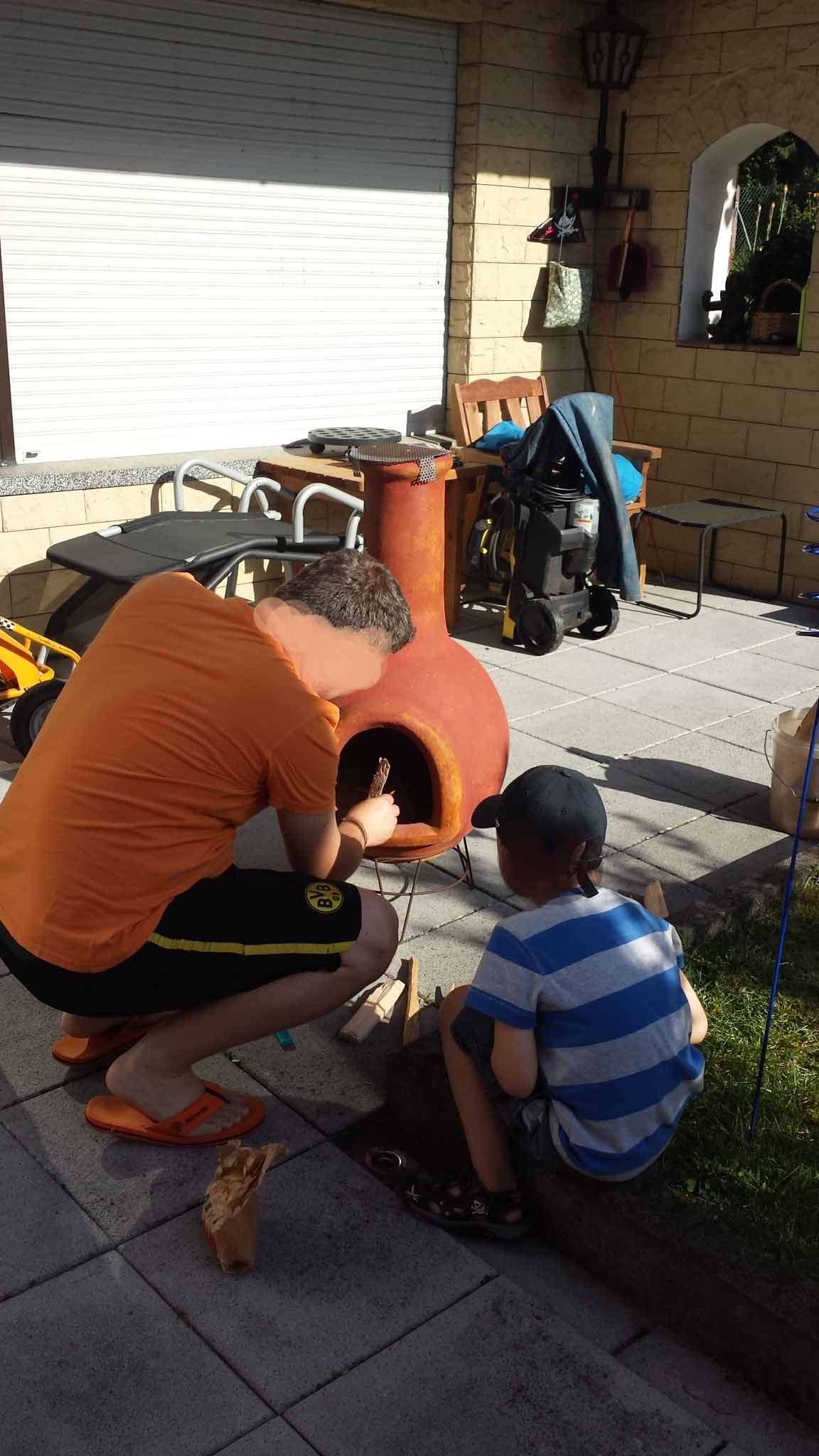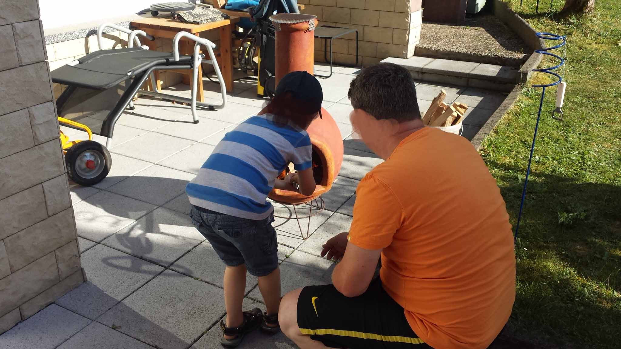 Die nächste Männersache war das versprochene Feuer. Aus Sicherheitsgründen haben wir den mexikanischen Kamin hergenommen, es war ja überall brottrocken. Der Junior hat sich nicht dumm angestellt.
