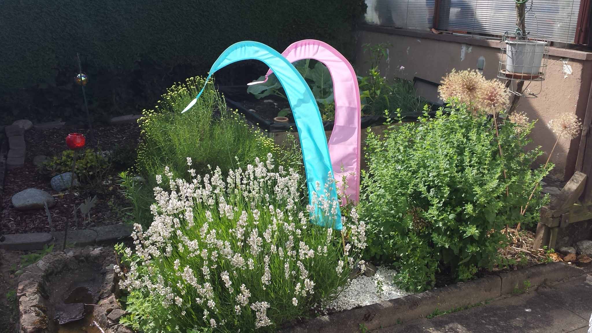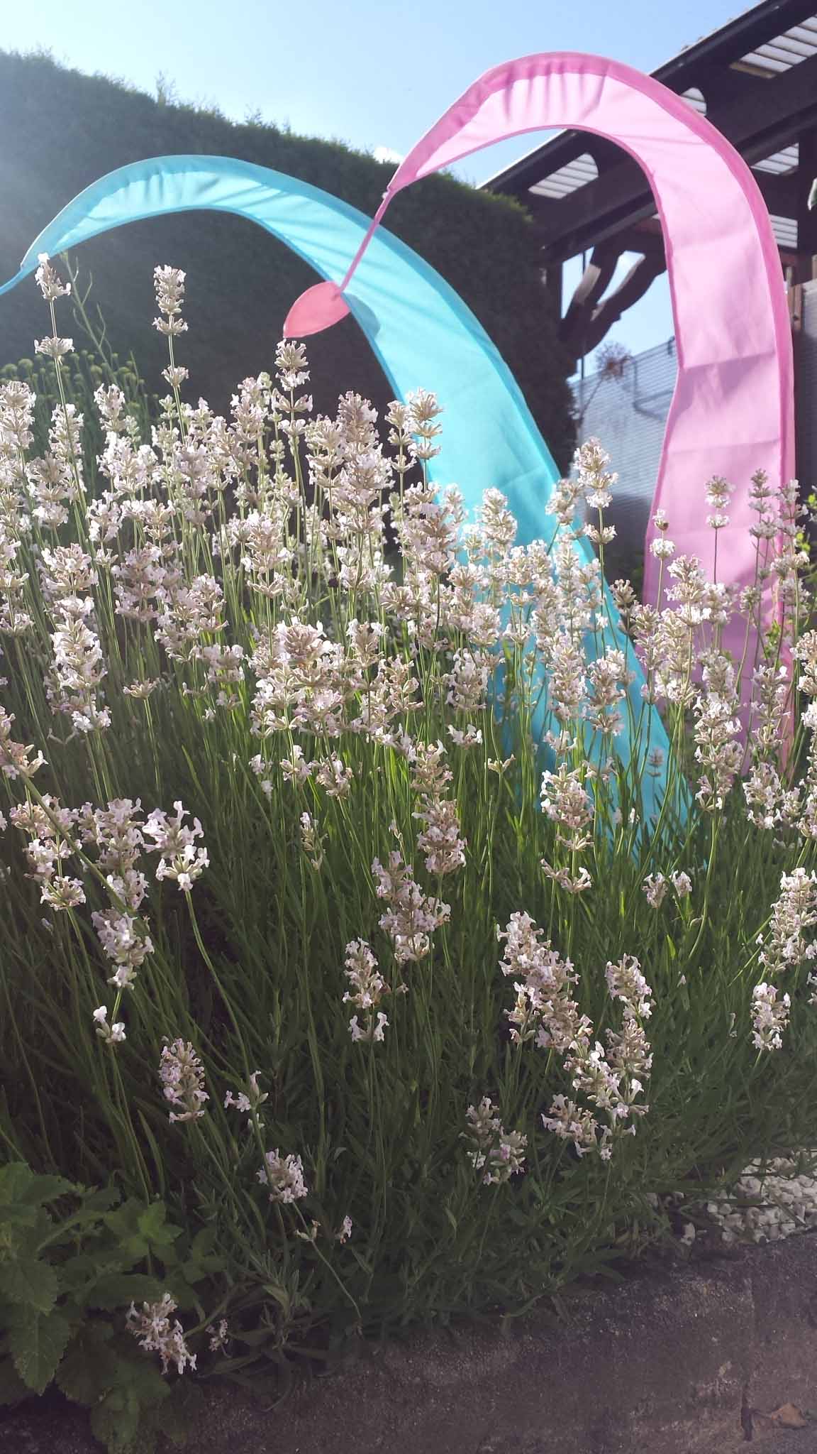 Und weil man zu einer Gartenparty auch Dekoration braucht, haben wir überall um den Sitzbereich die Gartenfahnen aufgestellt, bunt, in verschiedenen Größen. Lustig flatterten die Herzchen am oberen Ende der Fahnen.