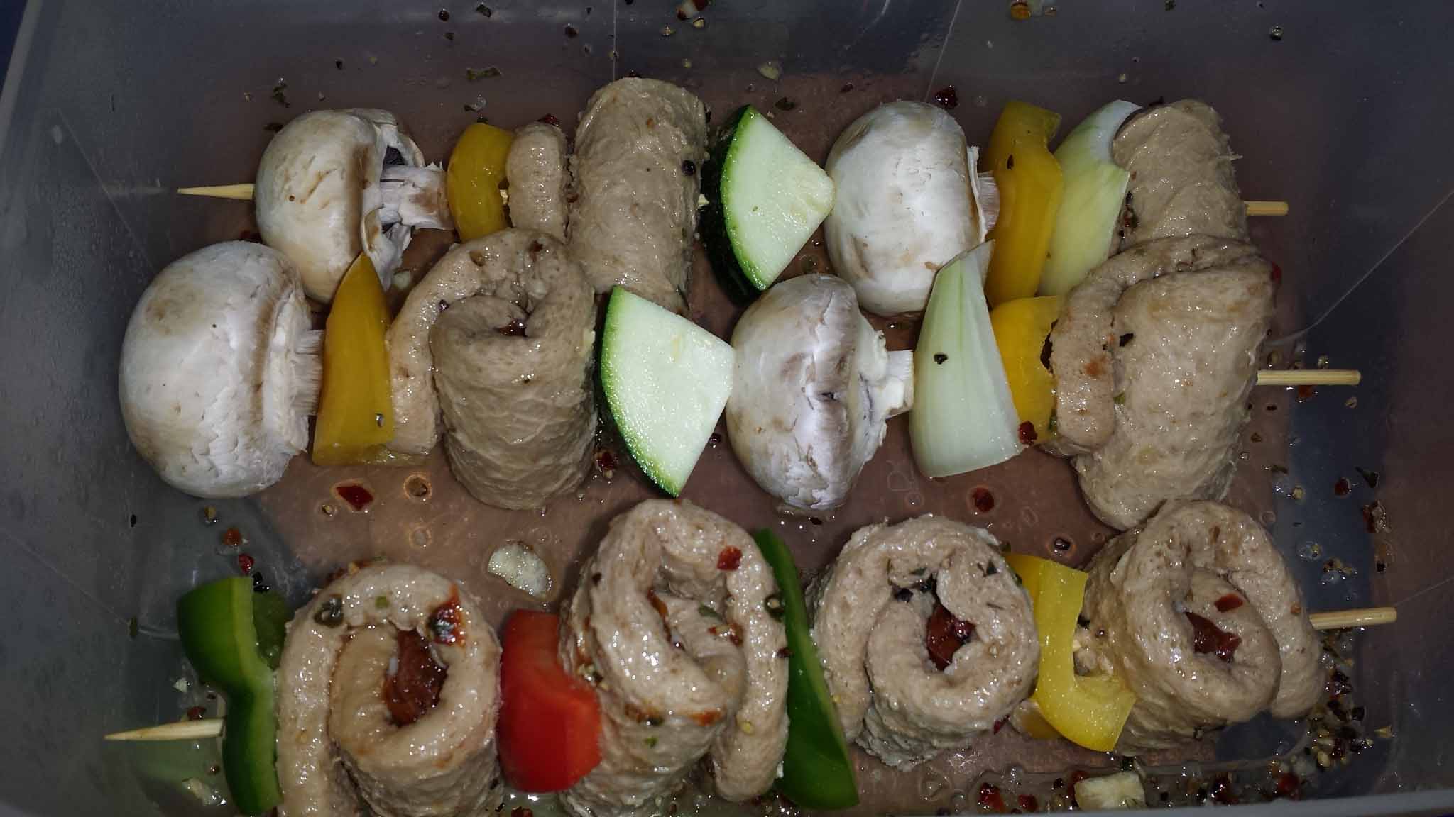 – Soja-Röllchen – Zwiebel – Paprika – Zucchini- Champignon – Spieße