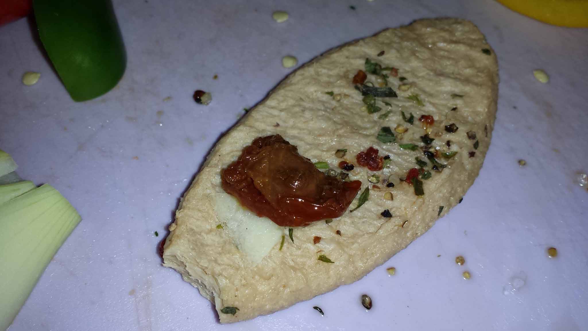 Also mit Salz und Pfeffer gewürzt, ein Scheibchen Knoblauch drauf und zusammen mit etwas getrockneter Tomate gerollt. Sah nett aus, schnell einen Spieß zum Fixieren rein und weitermachen.