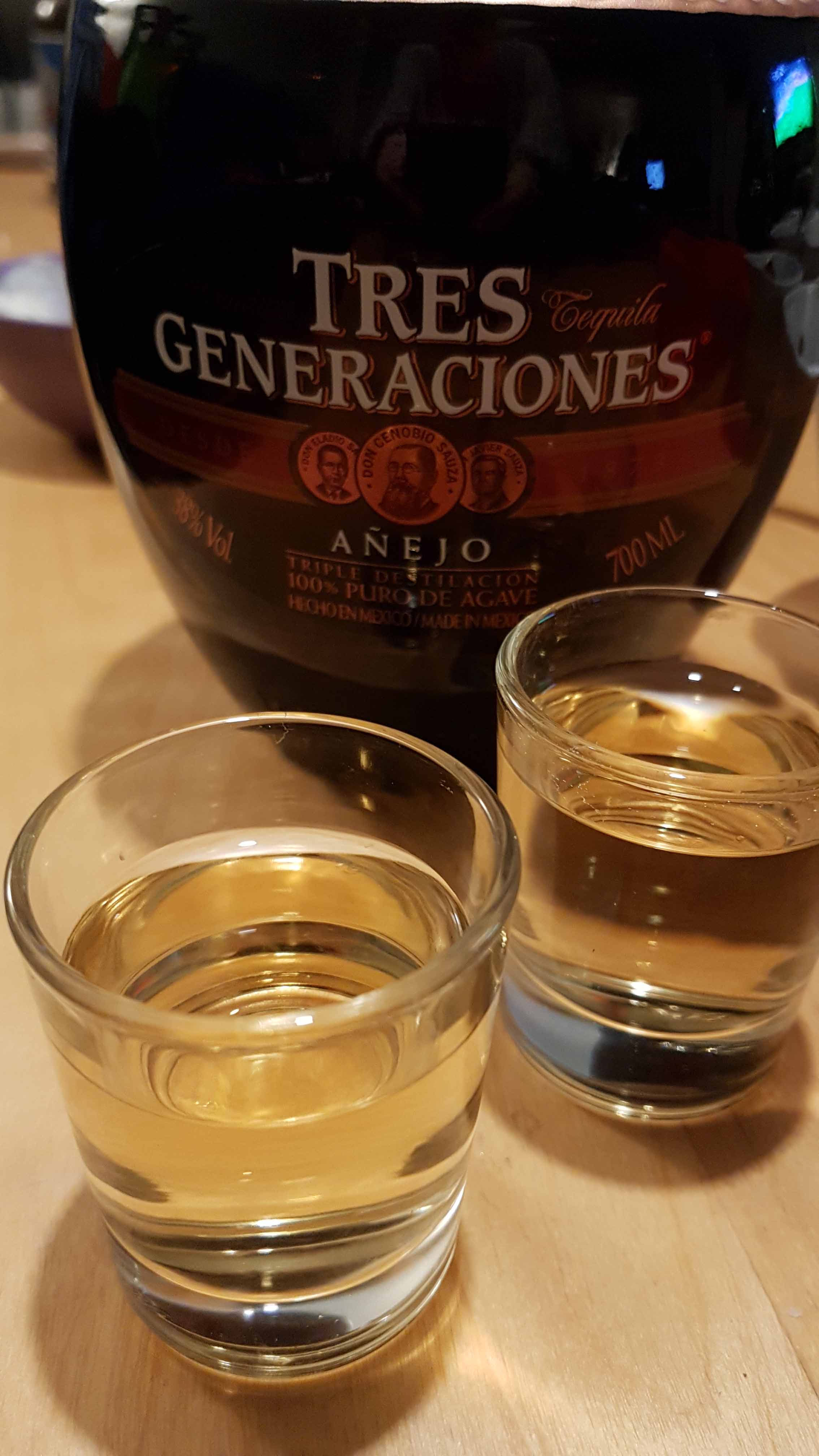 Dazu passt ein kühles Bier. Und als Absacker ein klassisch feiner Tequila, in unserem Fall ein Tres Generaciones, Anejo. (niiiiiiiiiiiiiiemals den mit Hut!)