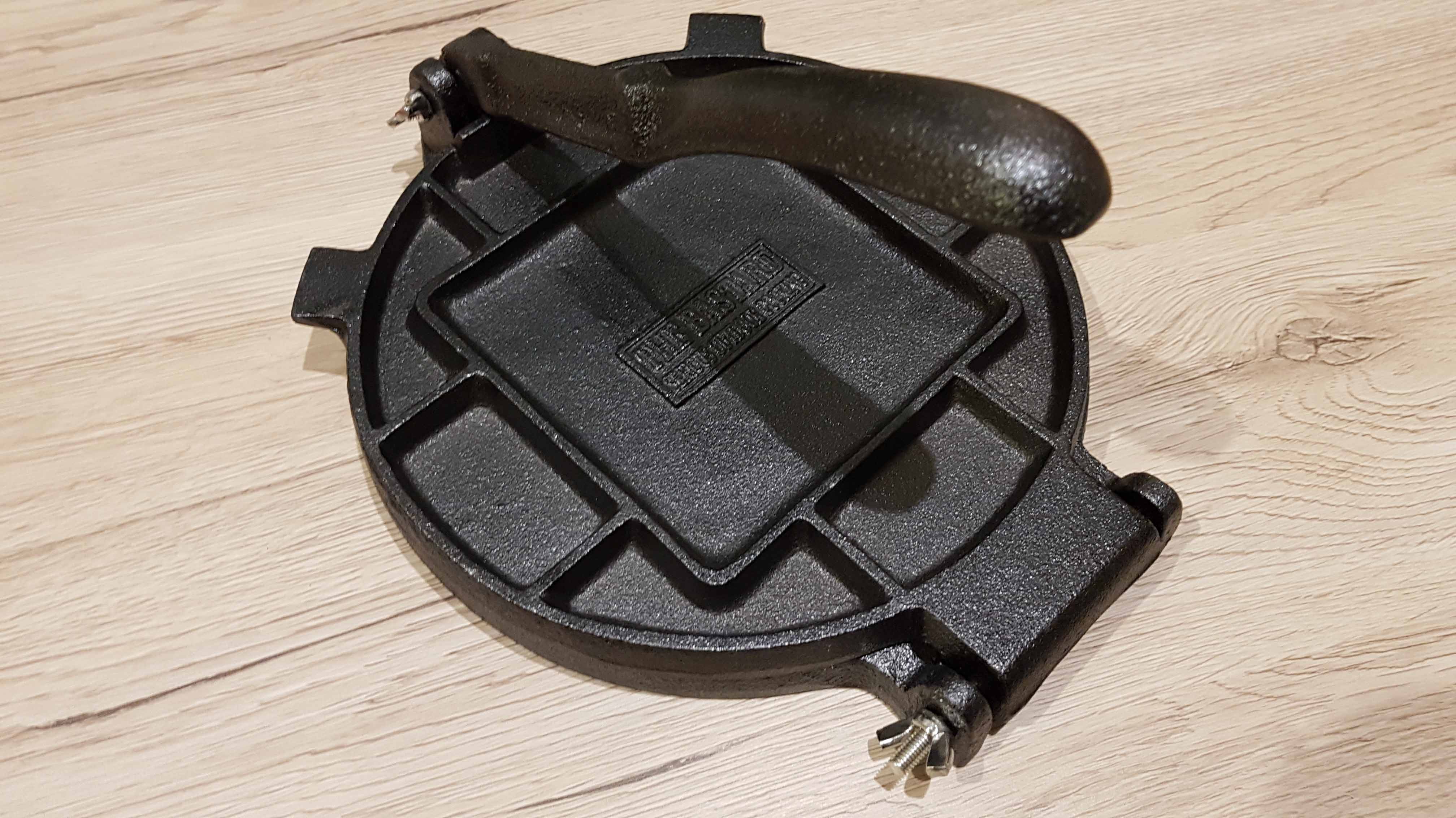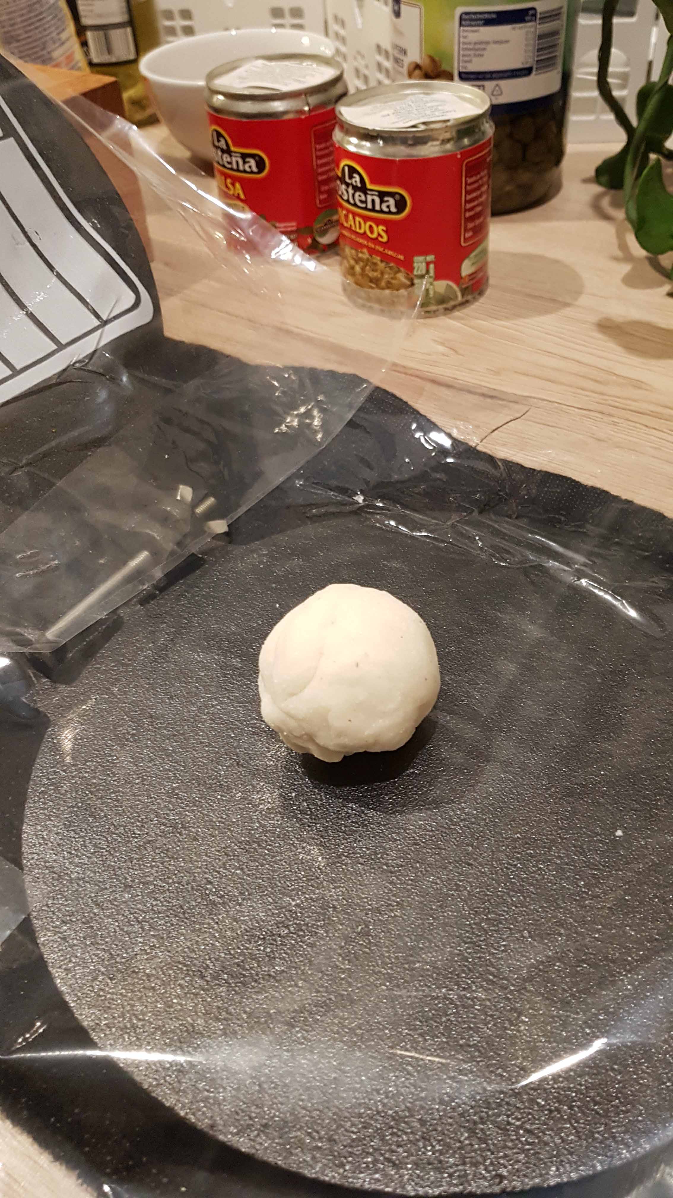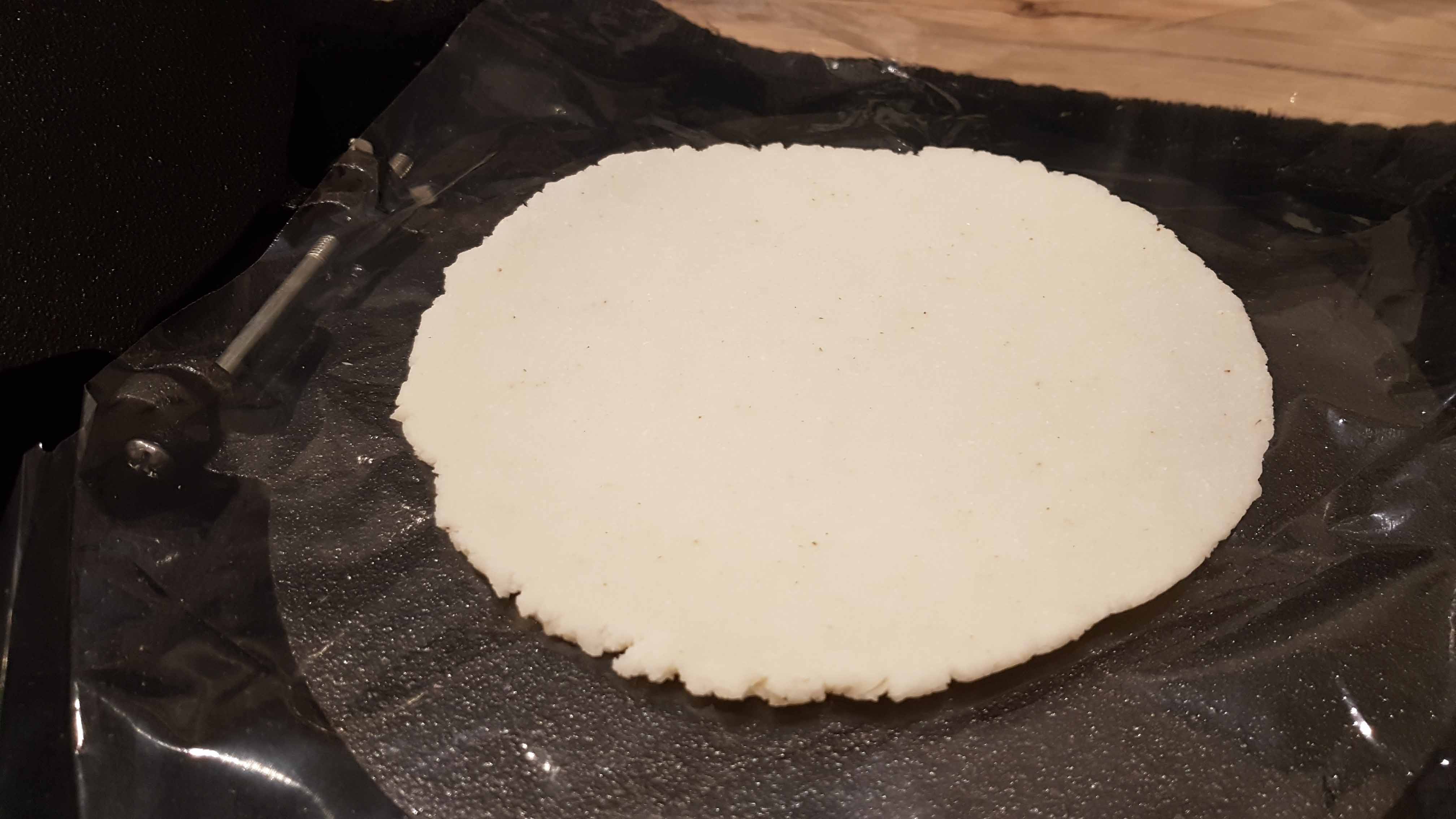 In der Tortillapresse (von The Bastard) wird die Teigkugel zwischen zwei Plastiktüten gelegt. Ich habe dazu einen Gefrierbeutel aufgeschnitten. Dann wird die Presse geschlossen und mit dem Hebel Druck erzeugt.