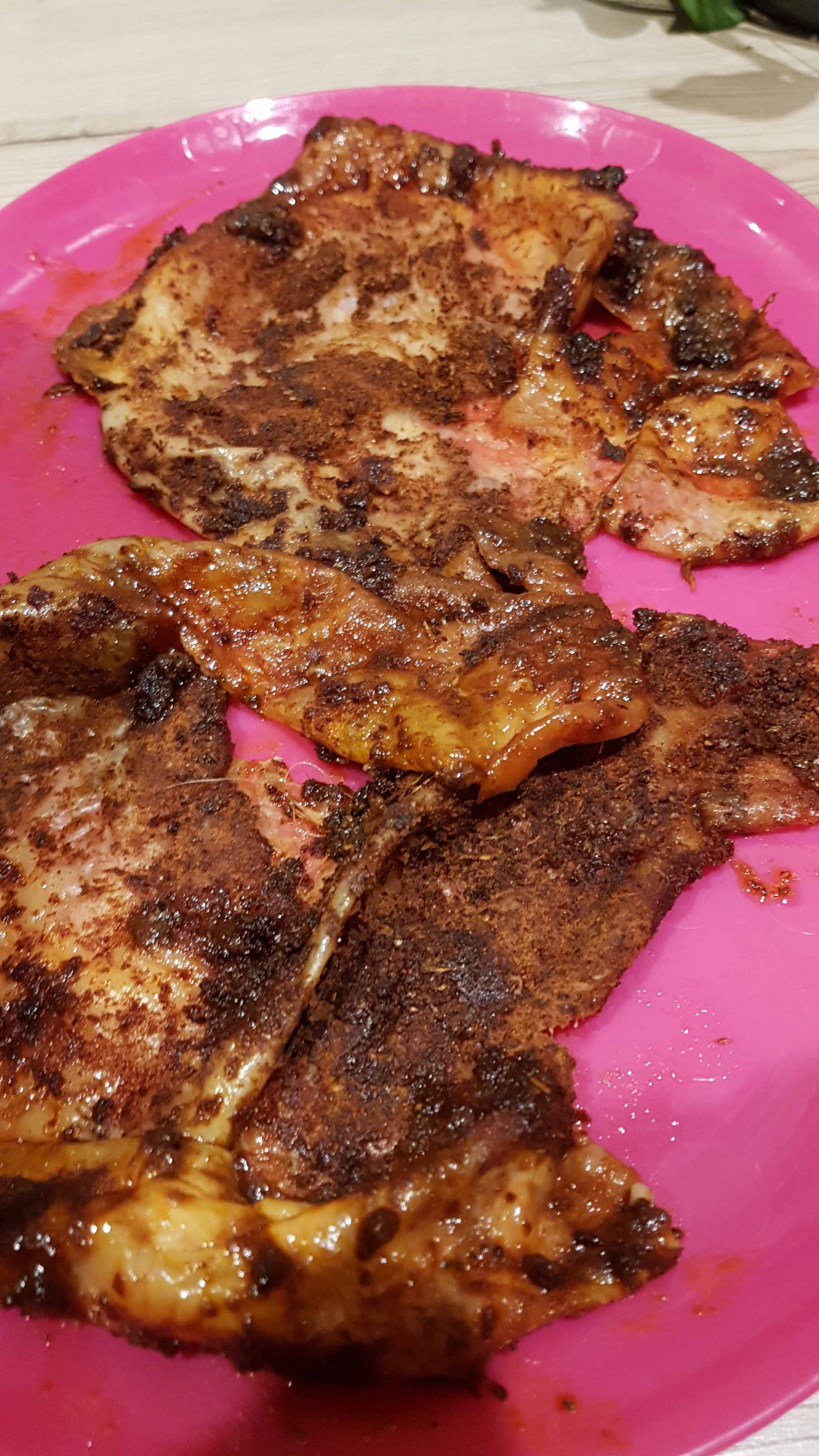 Du kannst ganze Hühnchen nehmen, oder nur die Brust, oder du verwendest wie wir Hähnchenschenkel. Hähnchenschenkel sind sehr saftig und wir würden sie wieder benutzen.
