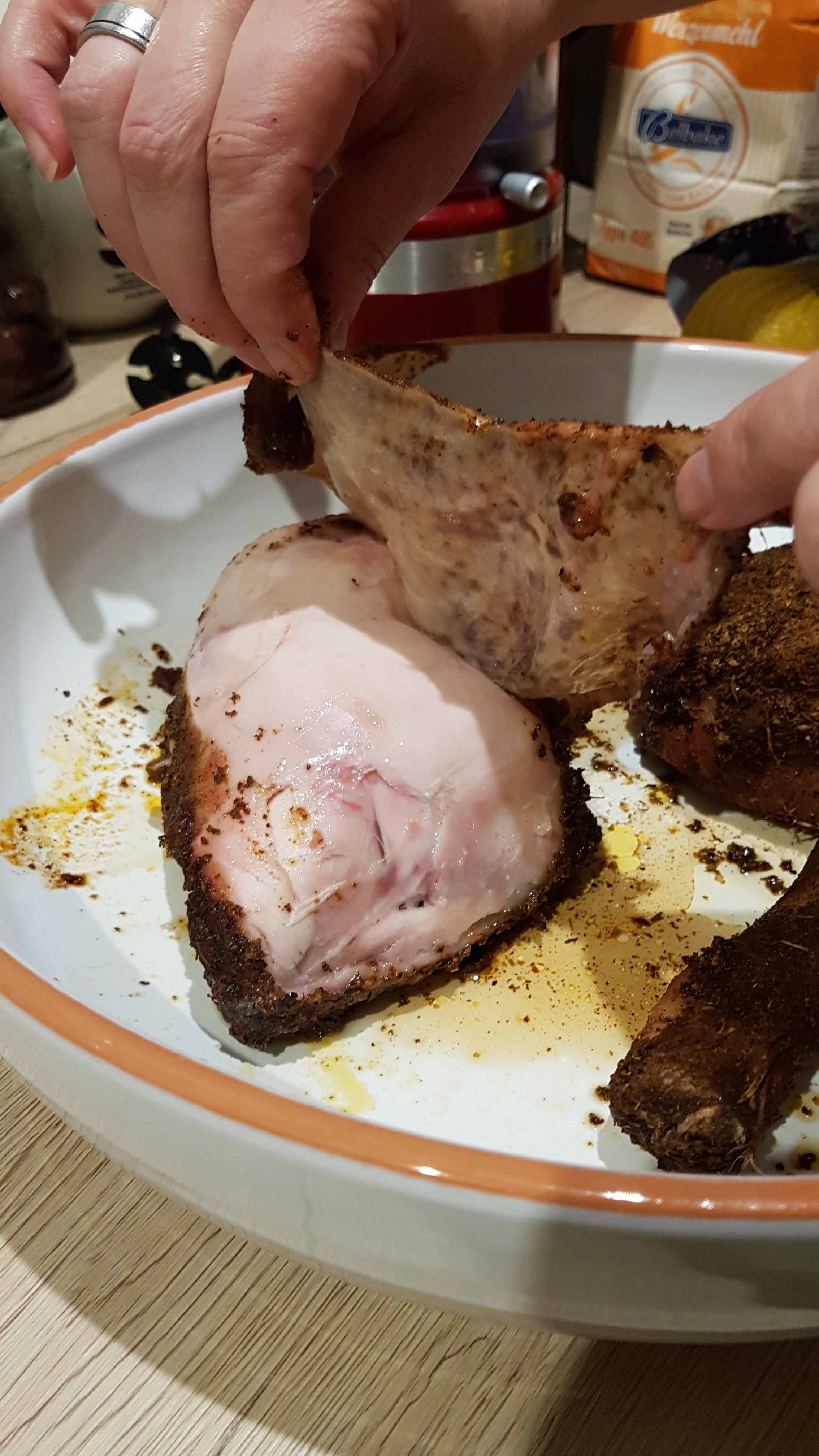 Wenn die KT erreicht ist, nimmst du die Hühnchenteile vom Grill und lässt sie etwas abkühlen. Dann kannst du die Haut vorsichtig abziehen und erst mal beiseite legen.