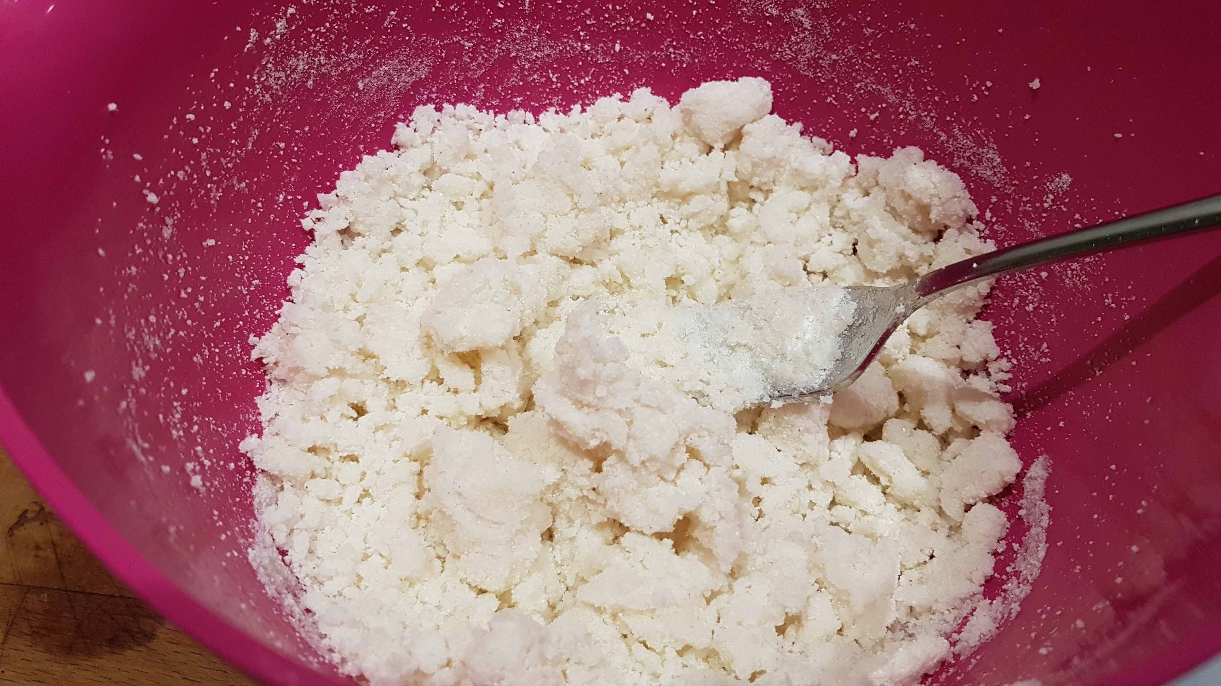 Dann eine Kugel formen und in Folie einpacken und im Kühlschrank mindesten 15min ruhen lassen.