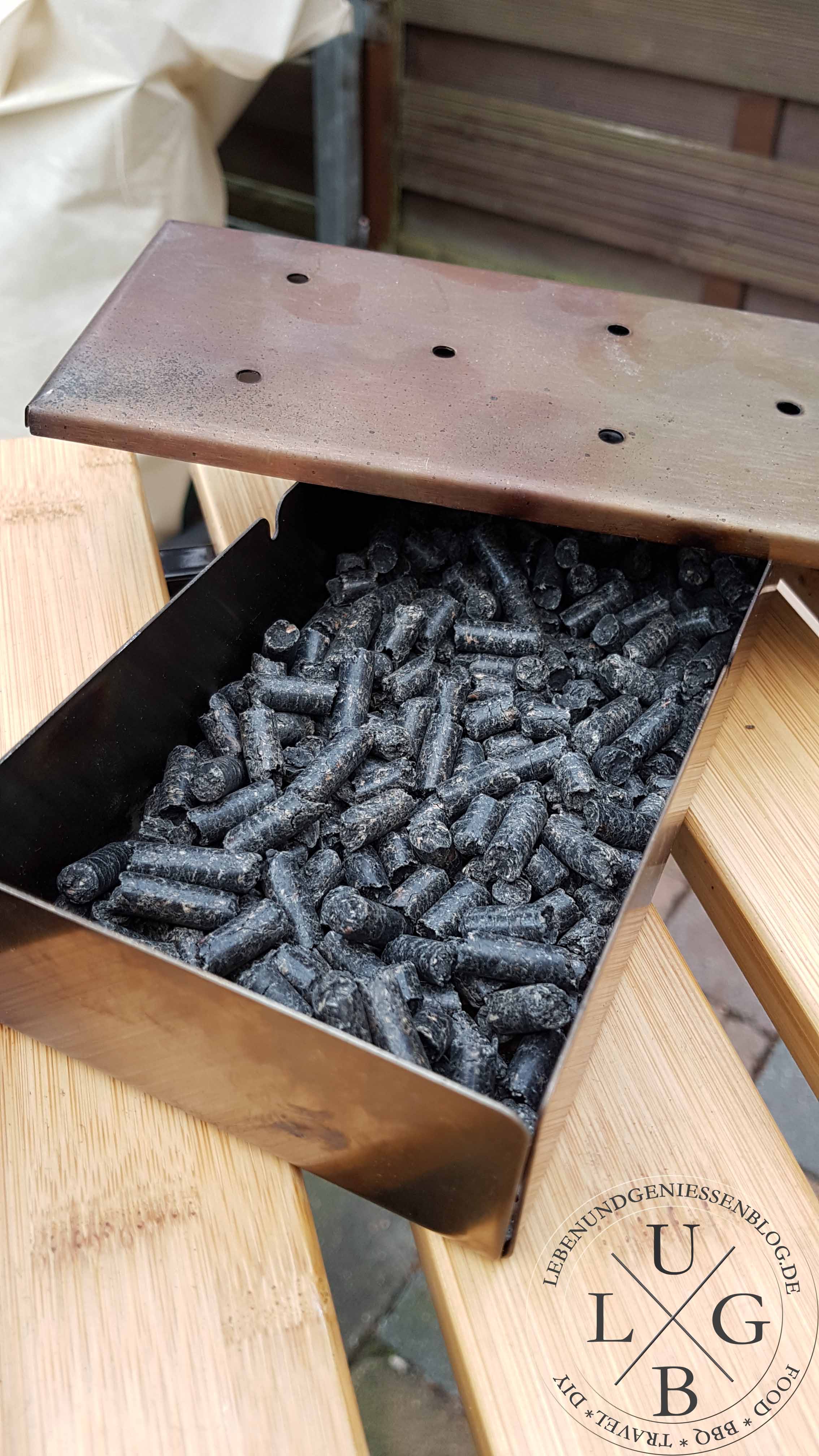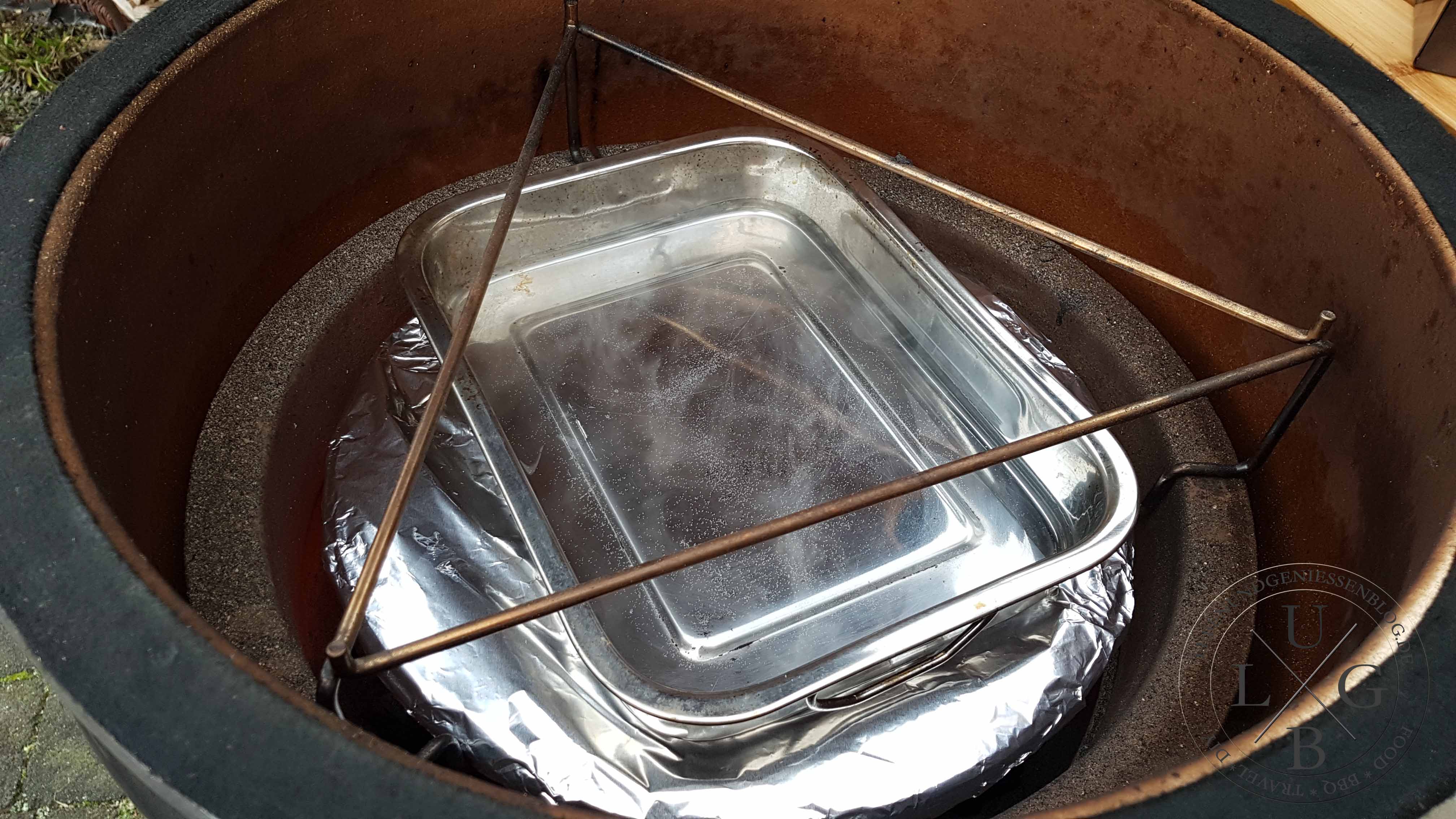 Dann haben wir den Heatdeflector eingebaut und eine Tropfschale drauf gestellt. Die Hühnchenteile lagen auf der ersten Ebene über der Tropfschale. Das war´s an Arbeit. Bis zum Erreichen der KT (82-85°C)kannst du die Füße hochlegen.