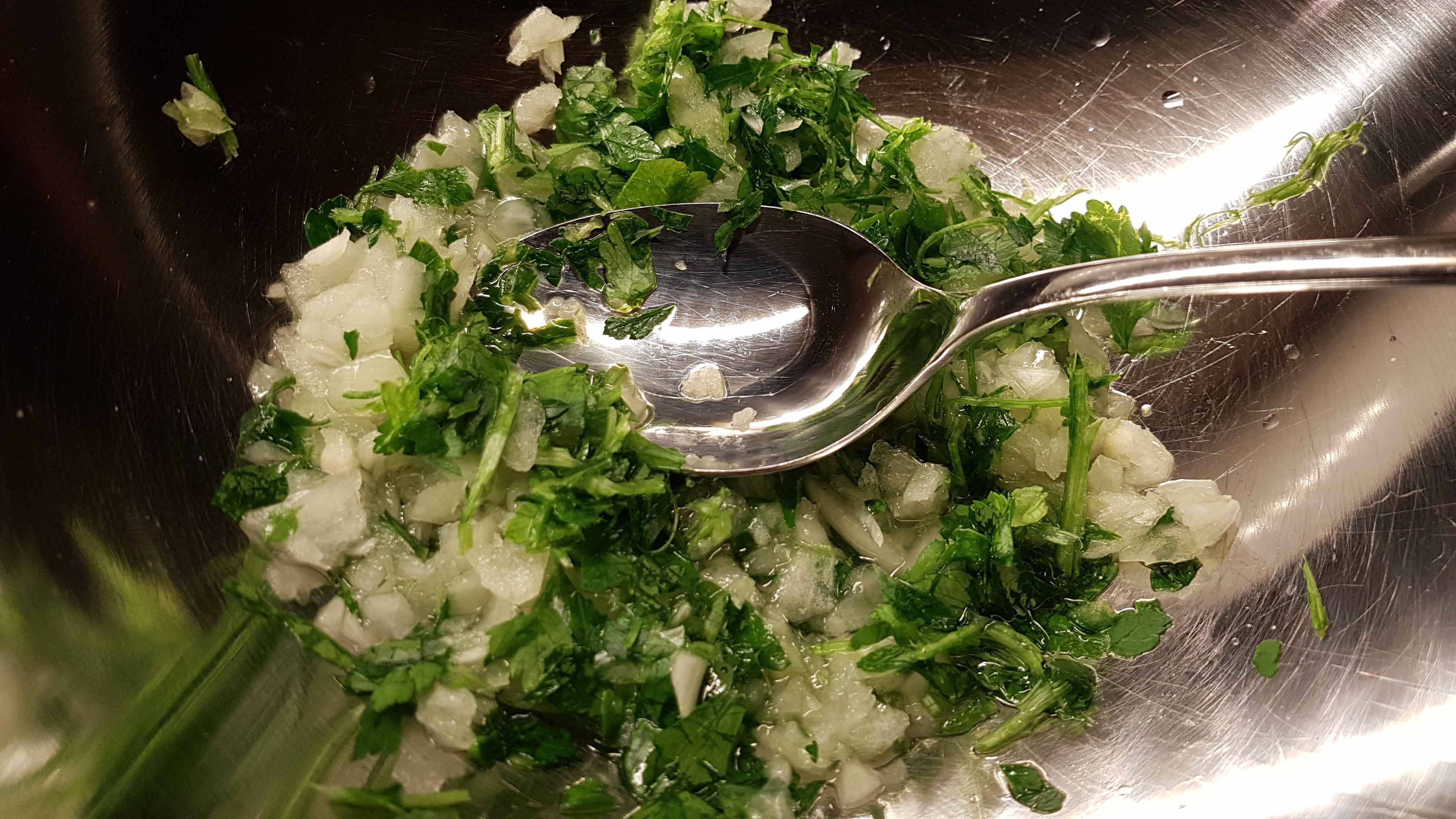 In einer Schüssel habe ich klein gehackte Zwiebeln und Petersilie mit etwas Essig vermischt und stehen lassen. Das nimmt den Zwiebel etwas die Schärfe.