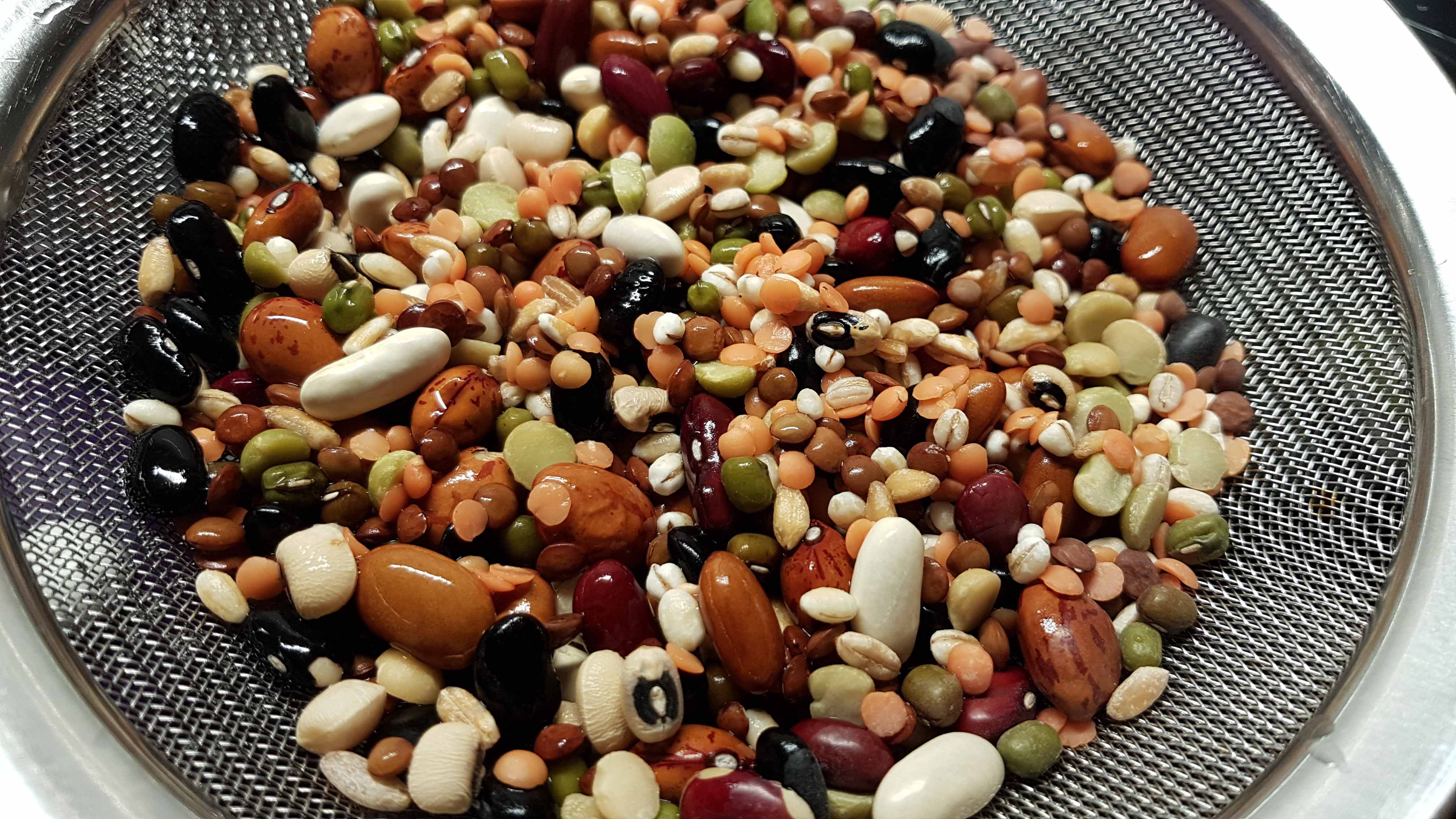 Der Inhalt: eine Mischung aus verschiedensten Hülsenfrüchten, eine ganz bunte Mischung. Da ich die original Verpackung irgendwann entsorgt hatte weiß ich nicht mehr, was genau drin war. Clever wie ich bin, hab ich wenigstens die Kochanleitung ausgeschnitten und dazu gelegt.