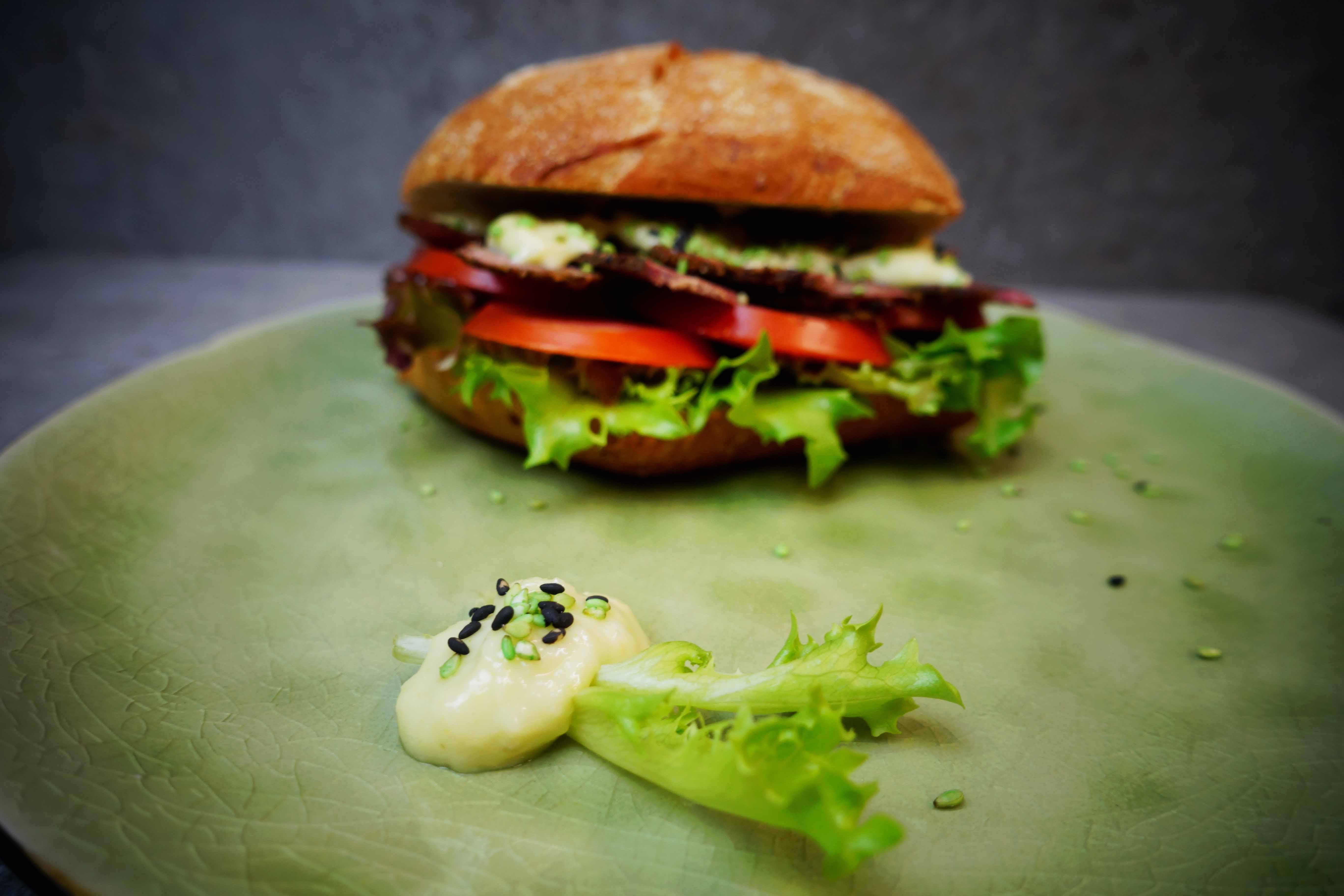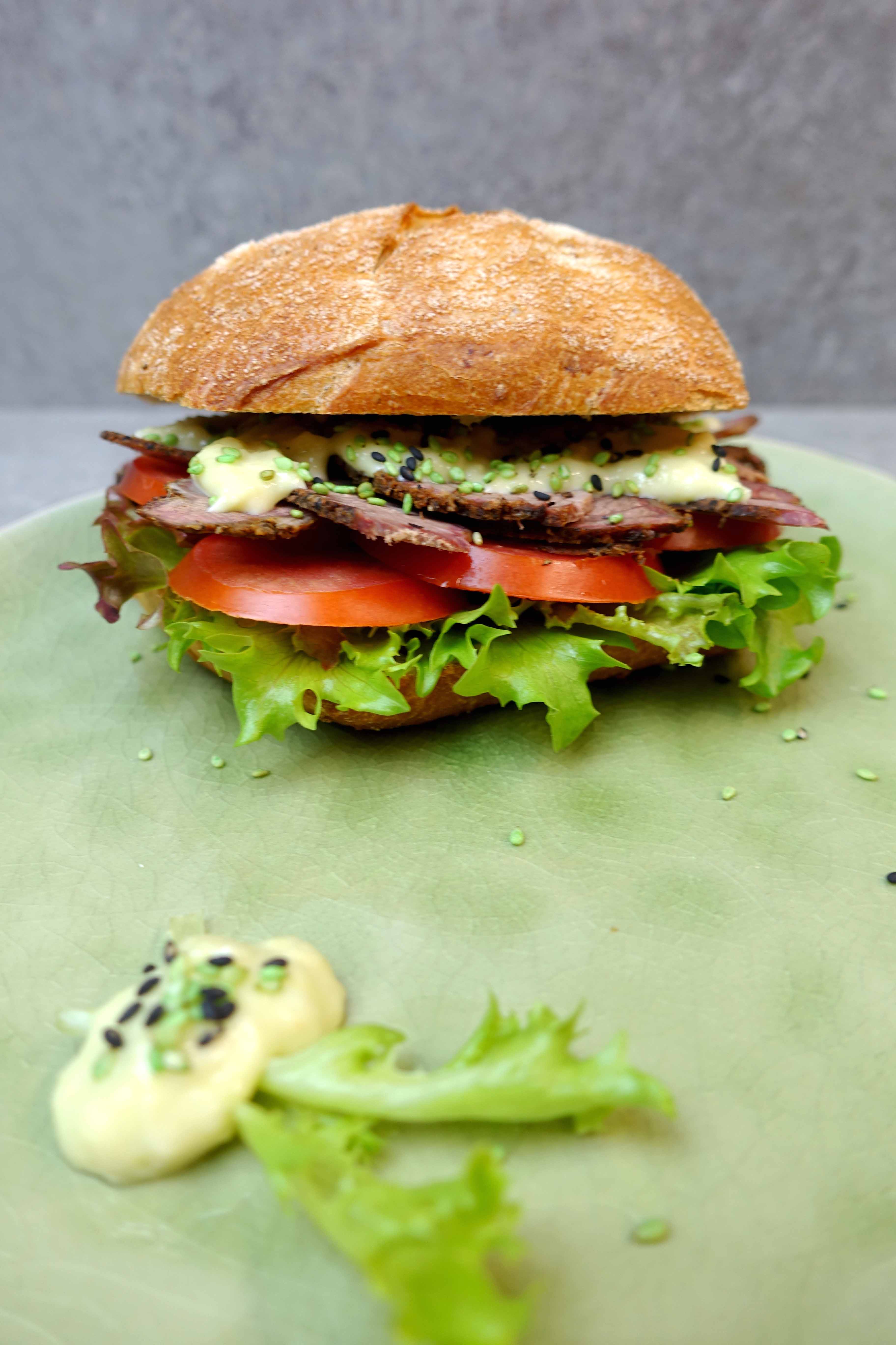Lecker Beef Brisket auf einem Bett aus Salat und Tomaten getoppt mit einer Meerrettich-Wasabi Mayo. Ein paar Wasabi Sesamsamen und schwarze Nigellas. Whohoooooo!