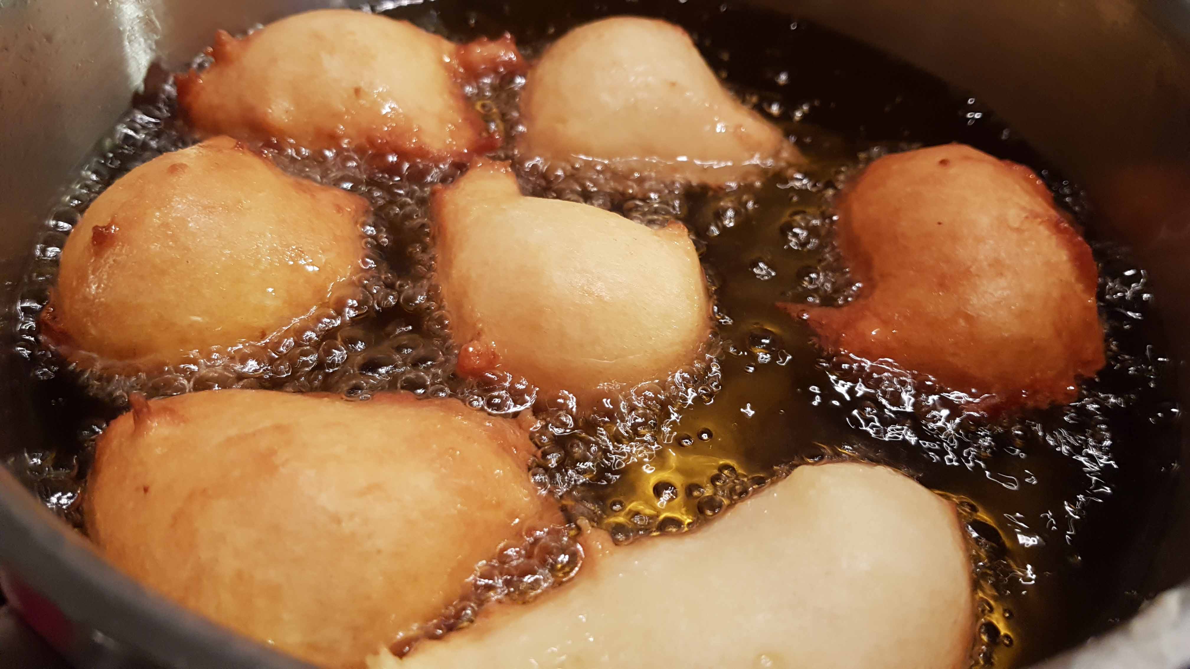 Das Öl erhitzen (Stäbchenprobe). Zu heißes Fett, die Mutzen sind innen noch flüssig. Zu kaltes Fett, die Mutzen kleben auf dem Topfboden fest.