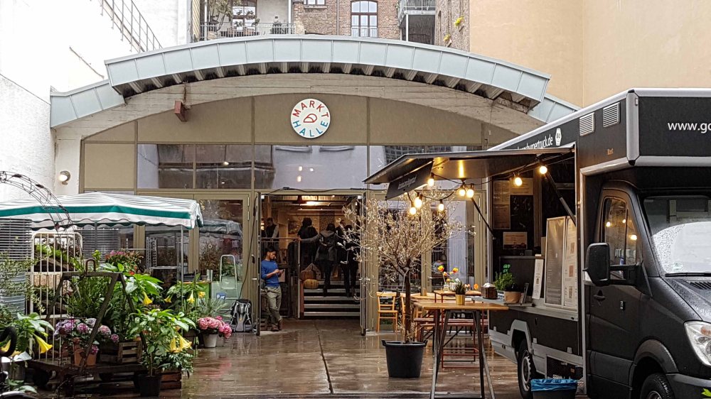 Der erste Stop war die kleine Markthalle. Wäre das Wetter toll gewesen, hätte man im Innenhof sehr gemütlich sitzen können. Naja, egal, die kleine Markthalle setzt auf Nachhhaltigkeit und Bio. Zudem haben wir dort zwar das teuerste Mettbrötchen ever gegessen, aber auch ganz sicher das Beste.