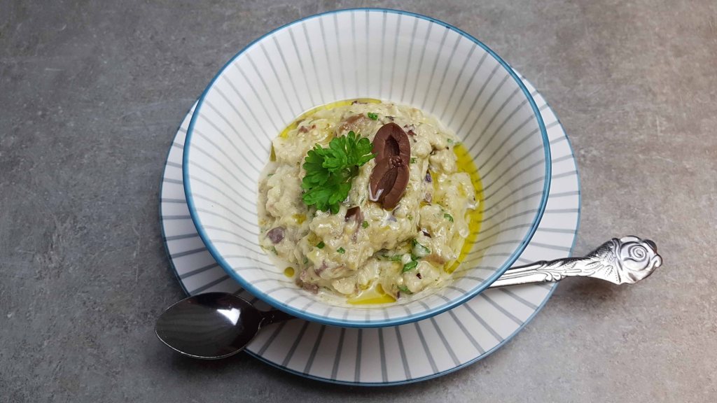 Das Innere der Aubergine klein hacken, mit Salz und Pfeffer würzen, das Tahini und die Petersilie dazugeben, die gehackten Oliven und etwas Olivenöl hinzufügen…..fertig!