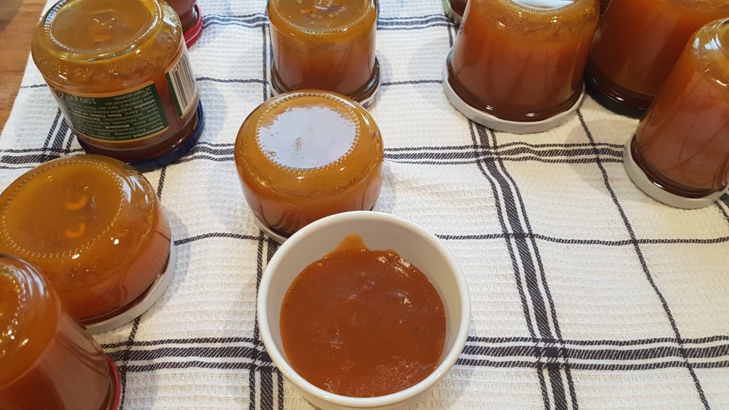 So, die 3 Marmeladensorten wurden mit Gelierzucker versetzt und nach Packungsangabe gekocht und in die sterilisierten Gläser abgefüllt, sofort verschlossen und auf dem Kopf stehend abkühlen lassen.