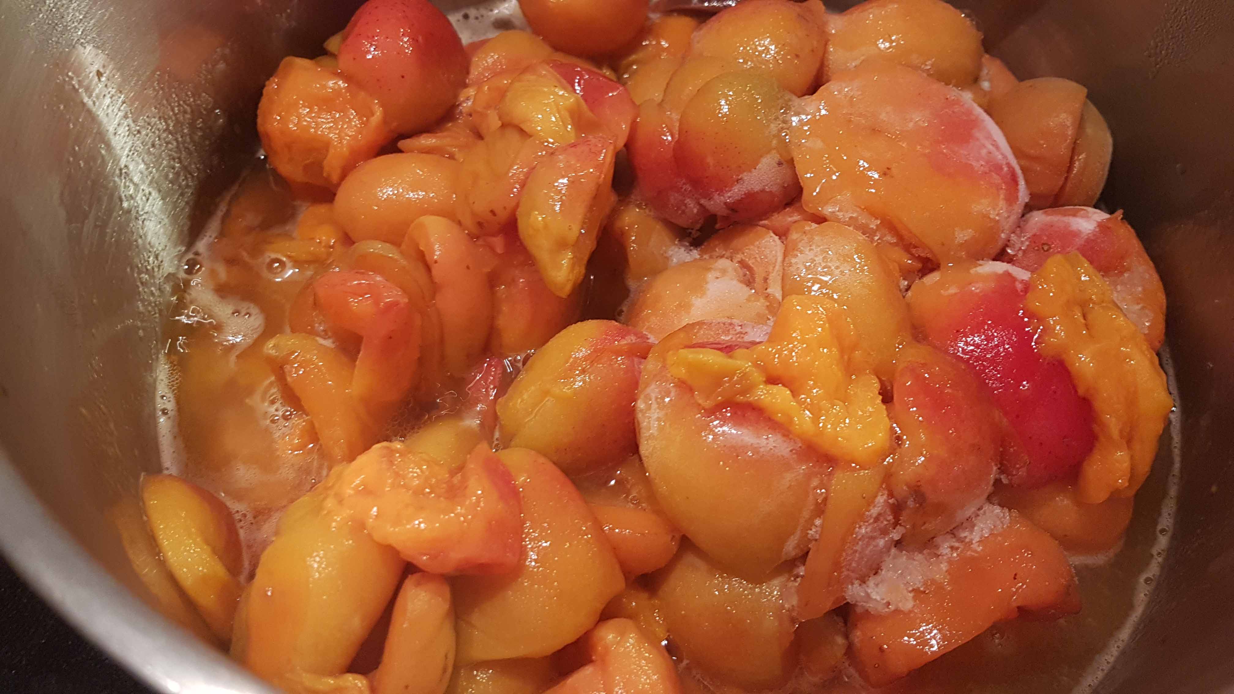 Die Aprikosen sind in den Topf gewandert und ich hab sie bei kleiner Hitze erst mal aufgetaut.