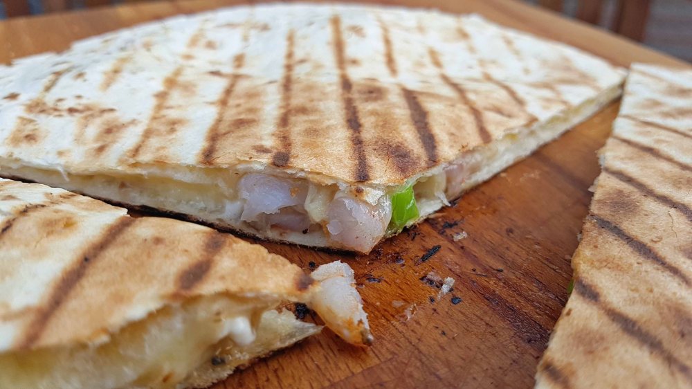 Die Quesadilla wird mit deinen Lieblingszutaten belegt und zu geklappt. Du kannst auch 2 Fladen übereinander legen…. ist egal, es muss nur Käse dazwischen sein, damit alles zusammenhält. Dann wird die Quesadilla in der Pfanne, auf dem Grill oder dem Kontaktgrill fertig gegrillt / gebraten. Bei moderater Hitze, damit der Käse schön schmelzen kann und du nicht Holzkohle fabrizierst bevor der Käse Temperatur gezogen hat.