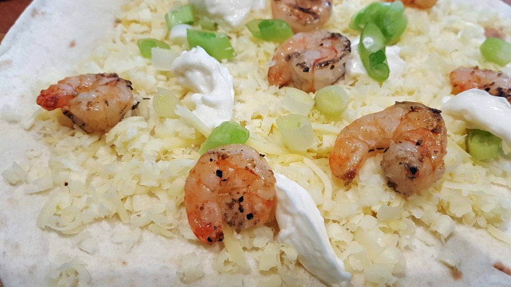 Wir hatten Cheddar, Schmand, Garnelen und Frühlingszwiebeln.