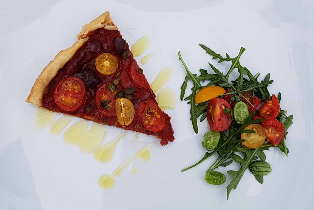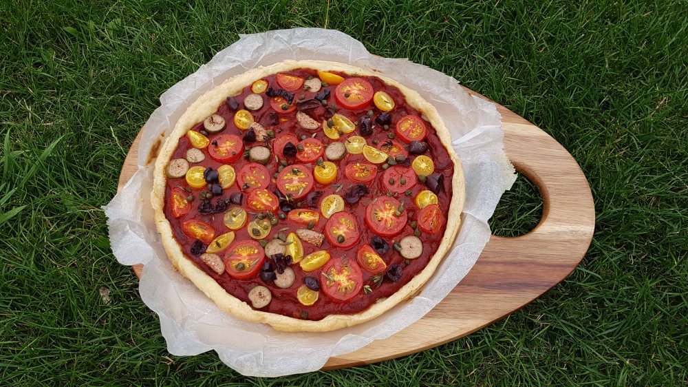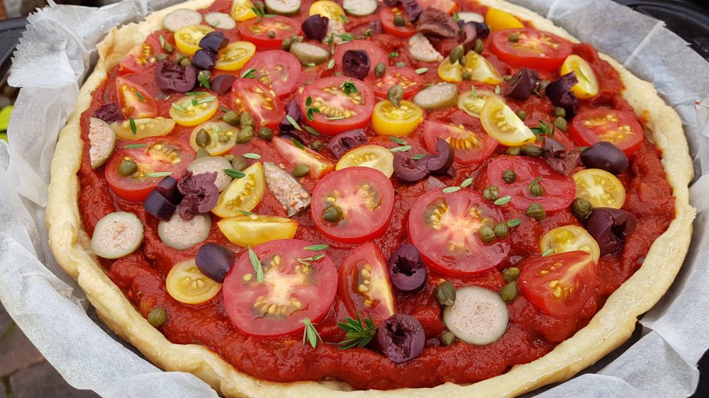 Das Tomatensugo auf dem Mürbeteig verteilen, die Tomaten, Kapernäpfel, Kapern und Oliven auflegen und zurück auf den Kamado.