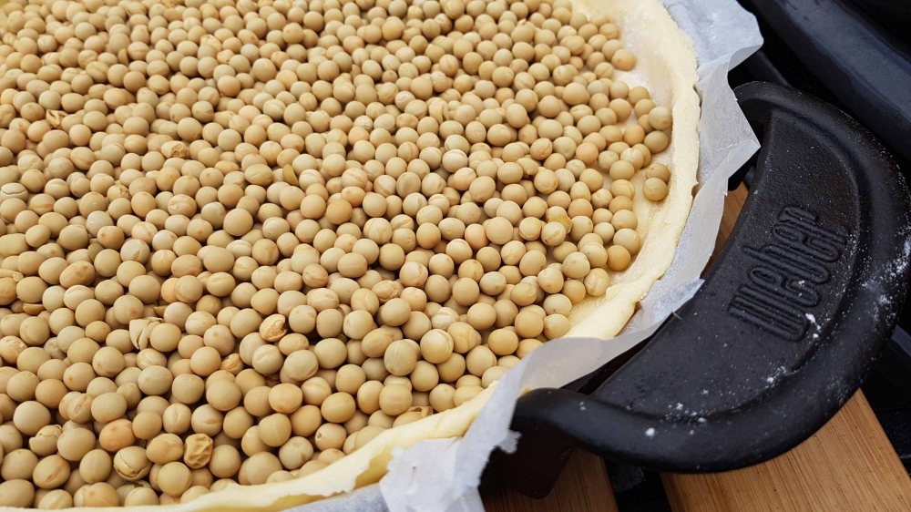 Gebacken habe ich den Teig blind, das heißt, ich habe Erbsen zum Beschweren des Bodens eingefüllt, damit er beim Backen keine Blasen bildet.