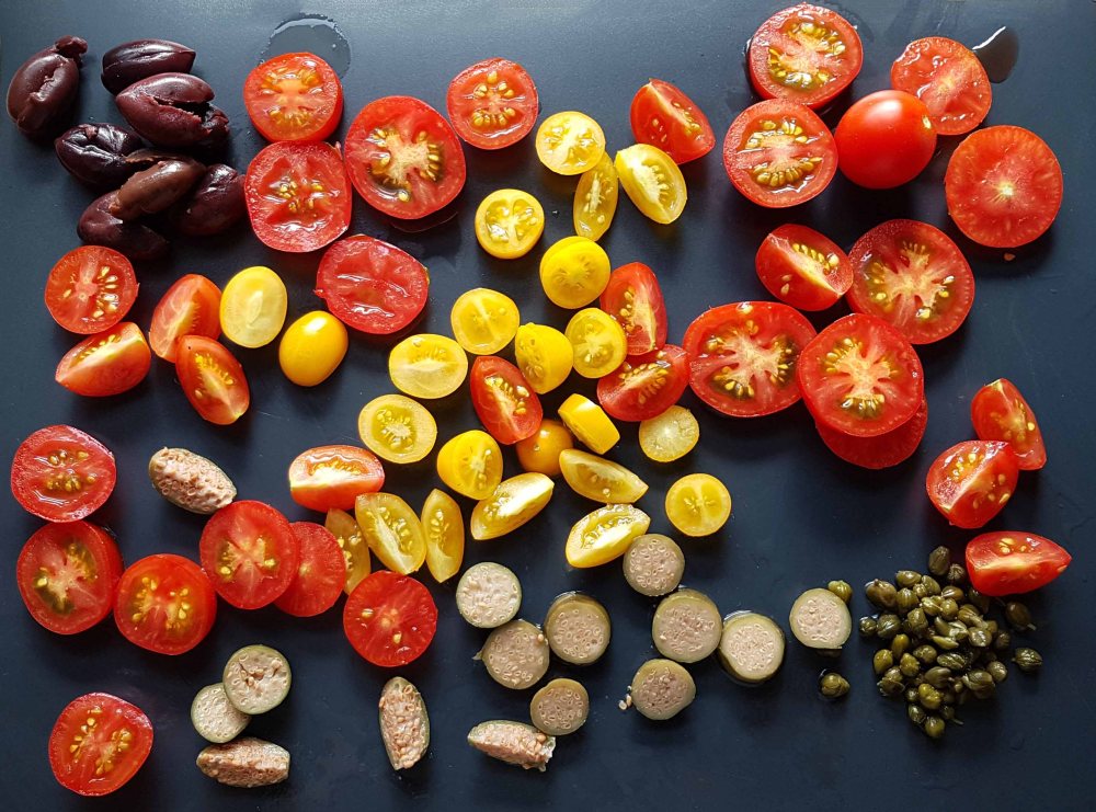 * Tomaten, am besten verschiedene Farben, verschiedene Schnitte (Viertel, Scheiben etc)