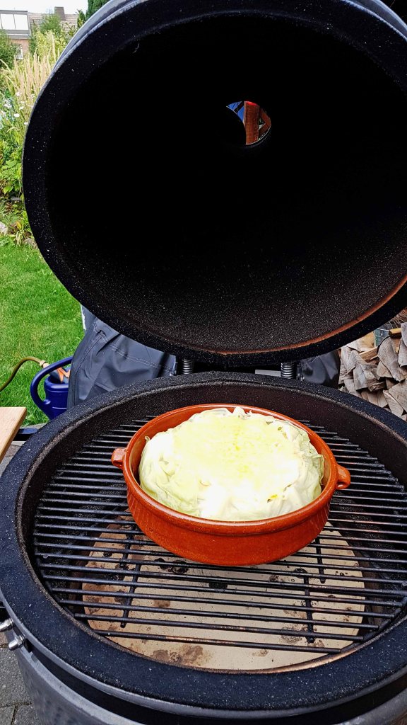Grillen vorbereitet. Die Temperatur betrug zwischen 210 und 230 Grad. Der Kohl wurde mit der Form für 40min gebacken, bis der Käse eine schöne Farbe hatte.