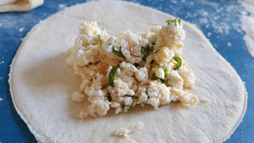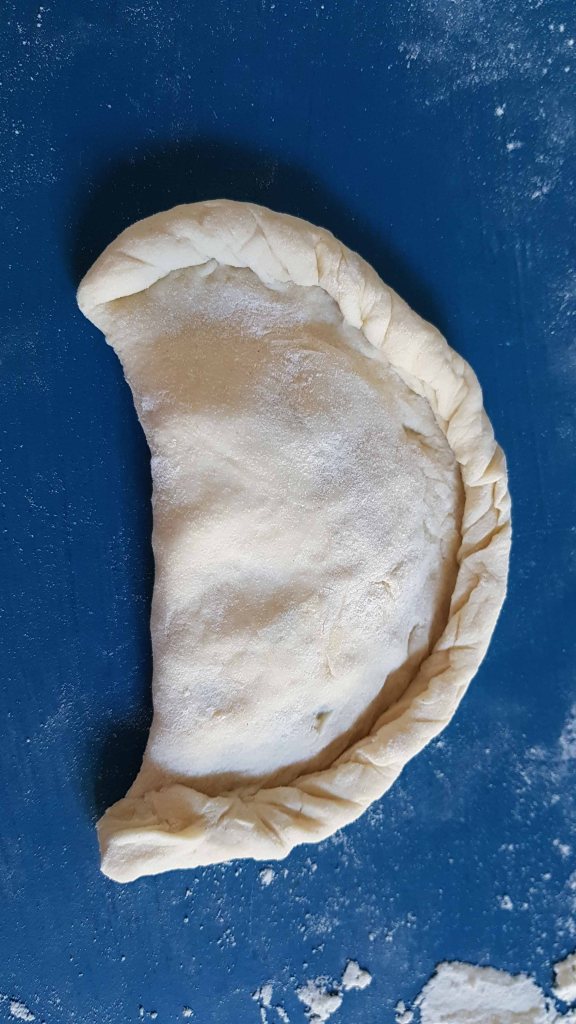 Den Teig dünn ausrollen, Kreise ausstechen (mit nem Glas), Füllung auf den Teig geben, zum Halbmond zusammenklappen und den Rand eindrehen.
