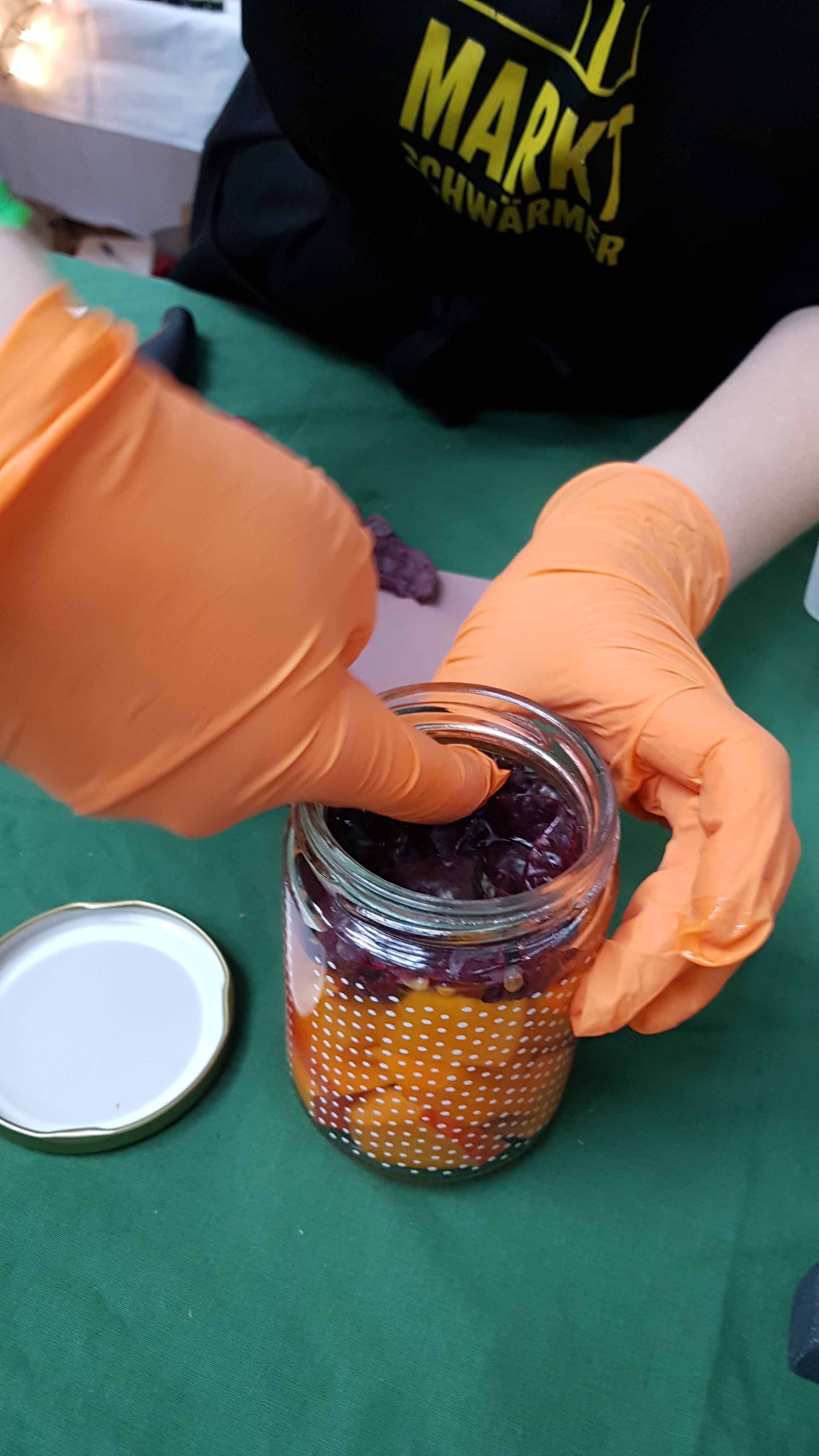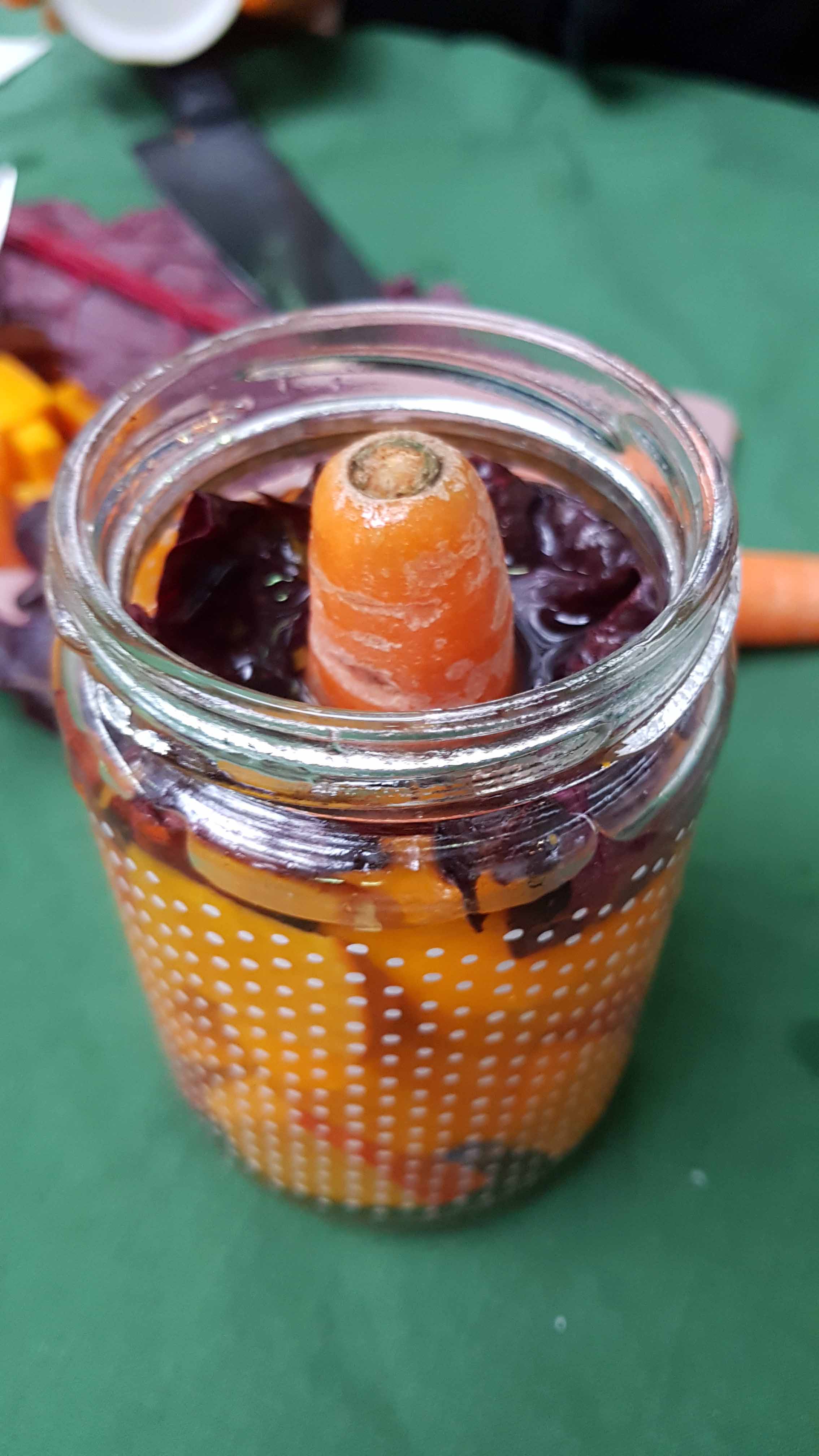 Bei den Marktschwärmern hat uns Julia in die Basiscs eingeweiht. Hokkaido Kürbis wurde in mundgerechte Stücke zerteilt, im Glas geschichtet und mit der Salzlösung (20g Salz auf 1l Wasser) bedeckt. Abgedeckt mit einem Mangoldblatt, es soll dafür sorgen, dass der Kürbis abgedeckt ist und die Flüssigkeit sich nur oberhalb des Blattes befindet. Noch einen Abstandhalter in Form eines Stückes Karotte…..sie hält den Kürbis unter Wasser, wenn der Deckel aufgeschraubt ist. Fertig, jetzt einfach stehen lassen und die Milchsäurebakterien ihren Dienst verrichten lassen.