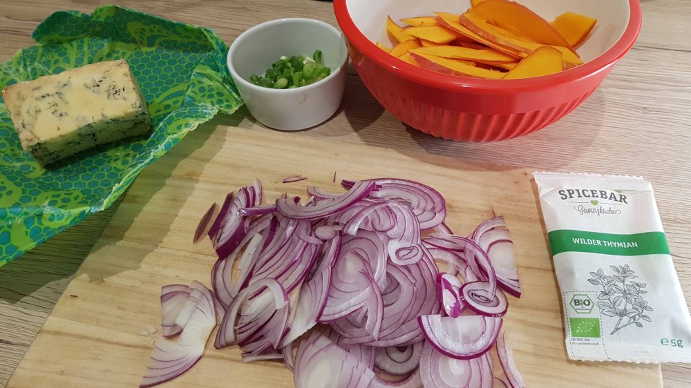 Ich hatte da noch einen Hokkaido Kürbis auf Vorrat liegen und Zutaten für einen Pizzateig habe ich immer da. Im Kühlschrank lag noch ein Stück Stilton, eingewickelt in ein Bienenwachstuch, welches ich selbst gemacht habe, war ein Versuch, ob diese Tücher wirklich halten, was sie versprechen…. ja tun sie, die Anleitung dafür poste ich in Kürze.