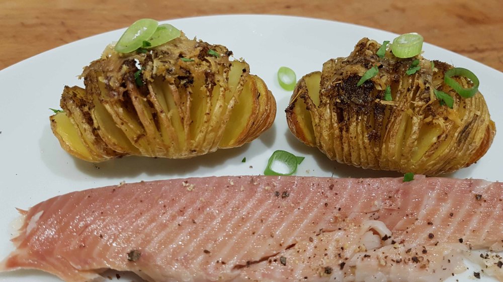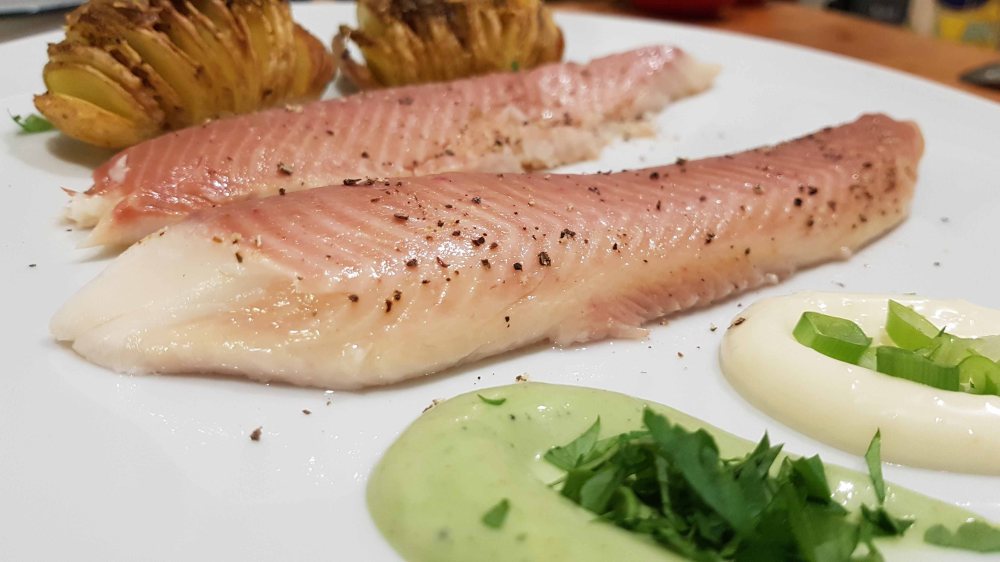 Ich habe die Forellenfilets ausgelöst und mit Hasselbackkartoffeln und 2 Dips serviert.
