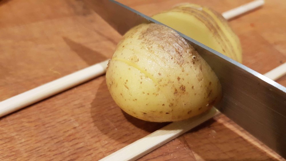 Die Kartoffeln fein einschneiden (nicht durchschneiden). Dazu eignen sich Eßstäbchen hervorragend als Abstandhalter. Man platziert die Kartoffel zwischen den Stäbchen und schneidet mit dem Messer dann runter bis man auf die Stäbchen trifft. Das geht recht einfach.