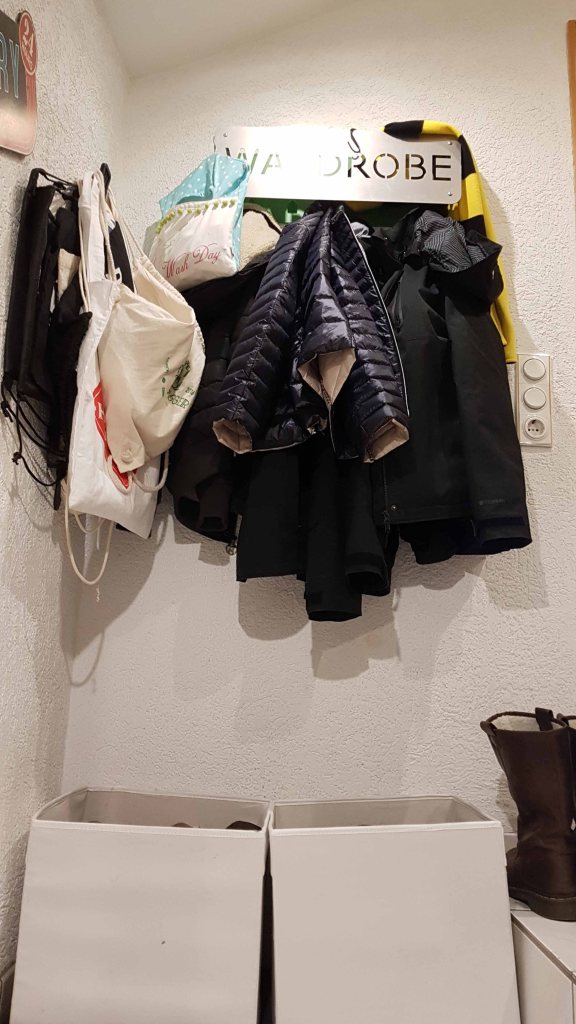 Kennste? Nägel in der Wand, Jacken dran, Garderobe fertig…… Matschmatte drunter für die Schuhe, Schuhregal fertig.