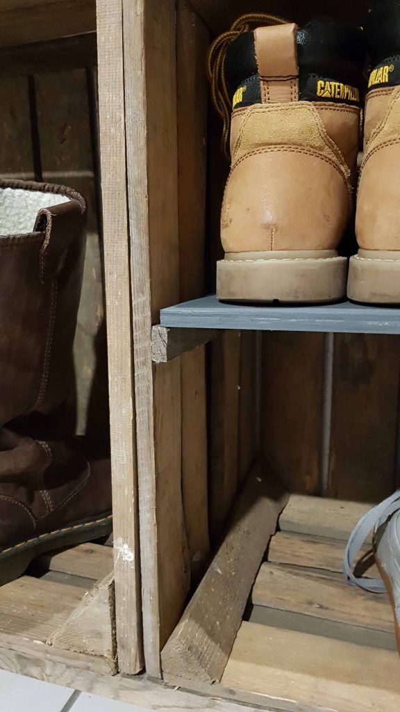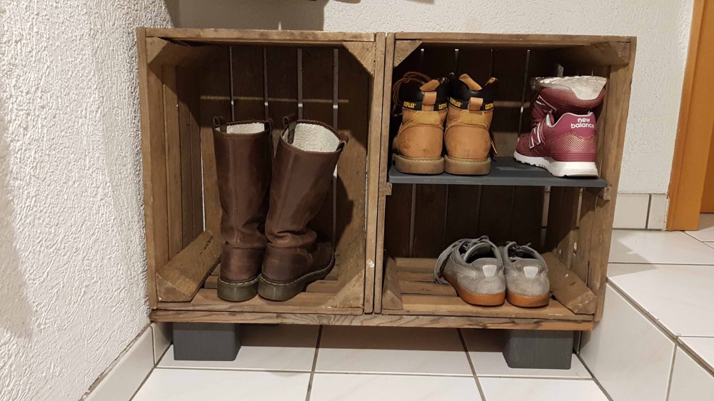 So halbherzig habe ich nach einer Kommode oder Truhe für die Schuhe geguckt, die genau in diese Nische passte. Sehr schwierig. Nix hat uns gefallen. Dann hab ich im Keller 2 alte Weinkisten stehen sehen. Für´s Wohnzimmer hatte ich mal 2 Regale gemacht, die uns bis heute gefallen ( siehe hier ).