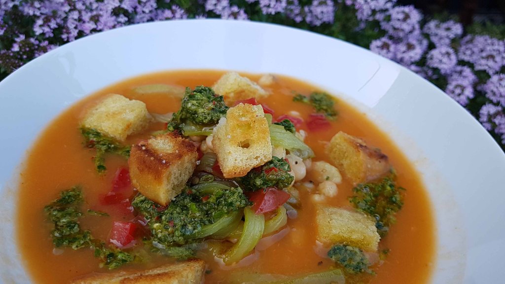 Gazpacho mit weißen Bohnen, Bacon, einer Gremolata, gerösteten Paprika und Croutons.