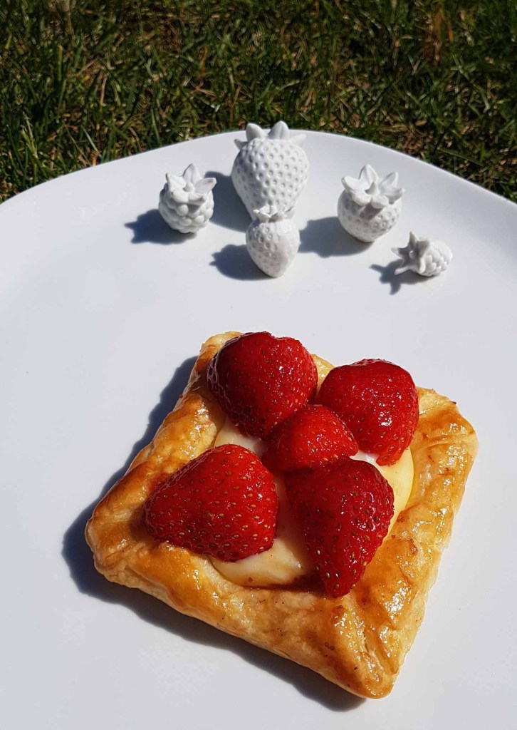 Die Plunder besteht, wie der Name schon sagt, aus Pudding (Vanille), Blätterteig und Erdbeeren.